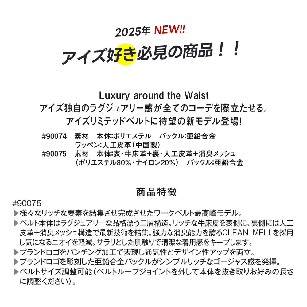 【素材】ポリエステル80%・ナイロン20% アイズ独自のラグジュアリー感が、現場でのスタイルを一段と引き立てる。 限定生産のデザインベルトで、働く人の腰回りをしっかりサポート。