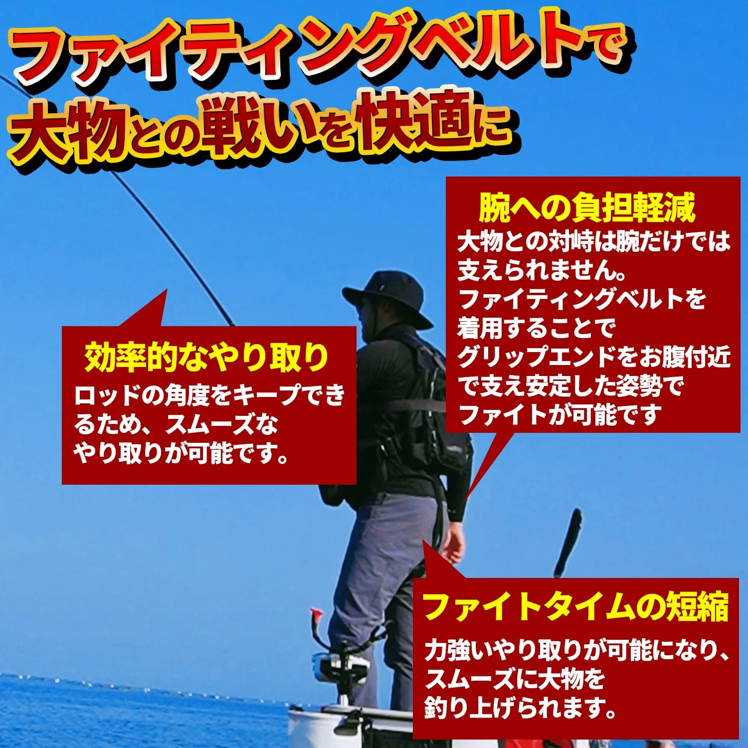 【体への負担軽減】フィッシングベルトを使用することでお腹付近でグリップエンドを固定!ロッドを安定させることでオフショア釣り(船釣り)の不安定な状況でもパワフルな釣りをサポートします。