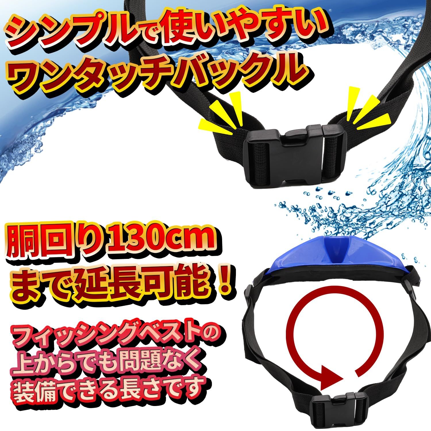 【バリエーション】どんな色にも合わせやすいブラック(黒)、釣りといったらのブルー(青)の2色をご用意!胴回り130cmまで延長可能ですので腰回りの大きい方やフィッシングベストなどを着込んでいてもそのまま装着可能です。