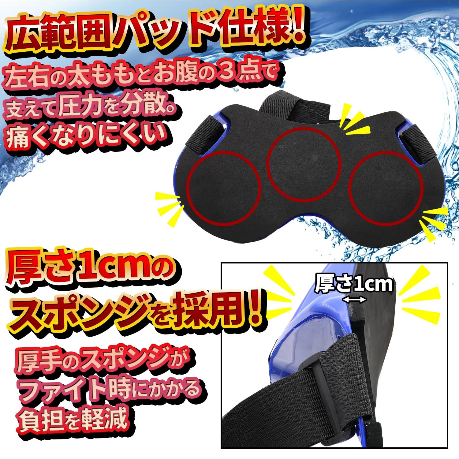 【広範囲パッド仕様】お腹+左右の太ももで支える広範囲パッド仕様!従来品のお腹1点にのみに圧力がかかるで生じる痛みを軽減し快適なファイトを楽しめます。