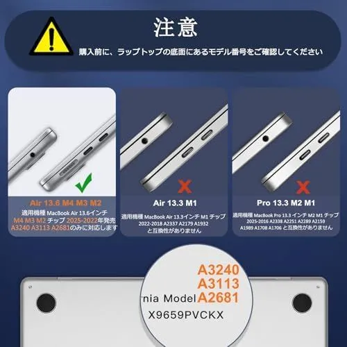 【商品概要】 - 対応機種:MacBook Air 13.6インチ(M2/M3/M4チップ) - 対応年式:2022/2023/2024/2025 - モデル番号:A3240 / A3113 / A2681 のみ対応 - 画面:Liquid Retina Display、Touch ID対応 - カラー:ビーチコテージ - 材質:プラスチック ハードカバー(半透明、NO Cut Out) - 放熱:通風スリットで安全な熱放出 - 操作性:装着したまま全ポート・ボタンにアクセス可 - 開閉:ケース装着時も135度まで可動 - 安定性:シリコン製フットで滑り止め・保護 - サイズ:ケース寸法 30.48 × 21.59 × 1.24 cm - 重量・厚さ:約8.7オンス/約1.5mm - 取り付け:着脱簡単、キズからしっかり保護 - 互換性注意:上記以外のモデル非対応。ご購入前に本体底面の「Axxxx」をご確認ください。 コメントなし即購入OKです。