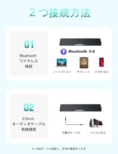 【2つの接続方法】 Nylavee PCスピーカーには、Bluetooth と3.5mmオーディオケーブルの2つ接続方法があります。ノートパソコン、デスクトップ、PC、携帯電話、タブレット、PS4など幅広いデバイスと互換性があります。