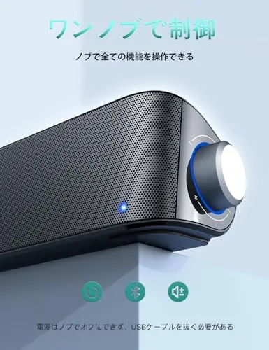 【USB給電&ワンノブ操作】 Nylaveeのサウンドバーには内蔵バッテリーはありません。USBケーブルを電源に接続し、自動的に電源がオンになります。一つのノブで音量調節や再生停止などの操作が可能です。