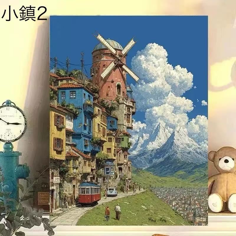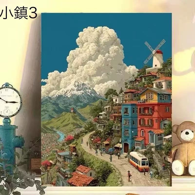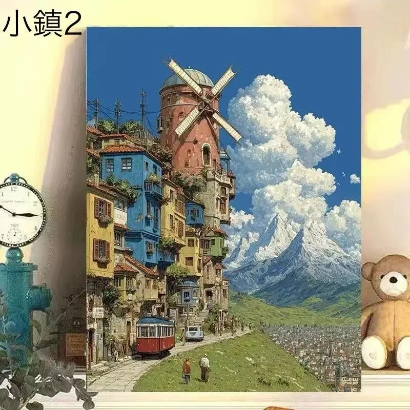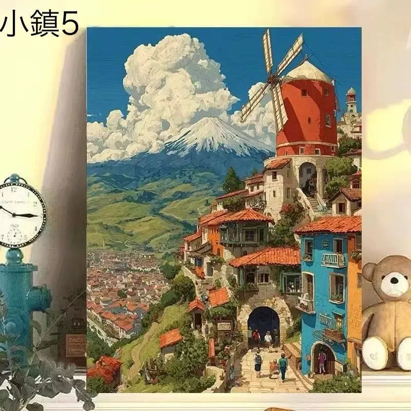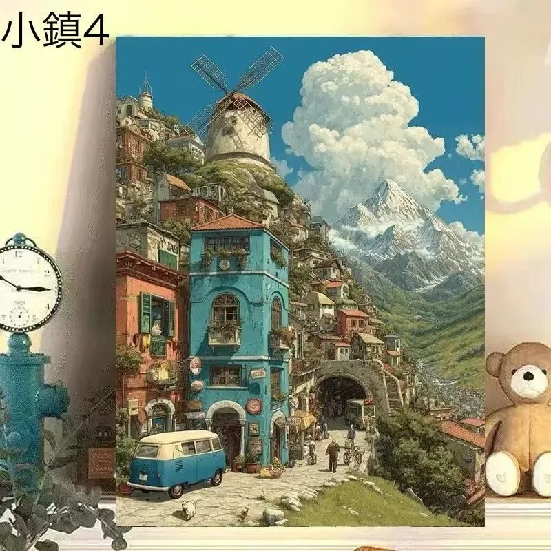 42.小鎮 数字油絵 小さい 塗り絵 パズル塗り絵 数字キット塗り絵 DIY diy デジタル油絵 手芸キット 水海 絵画 絵具付 数字絵 大人の塗り絵 油絵 ペイントバイナンバー 推し 推し活 趣味 30x40cm フレームなし 町風景 風景