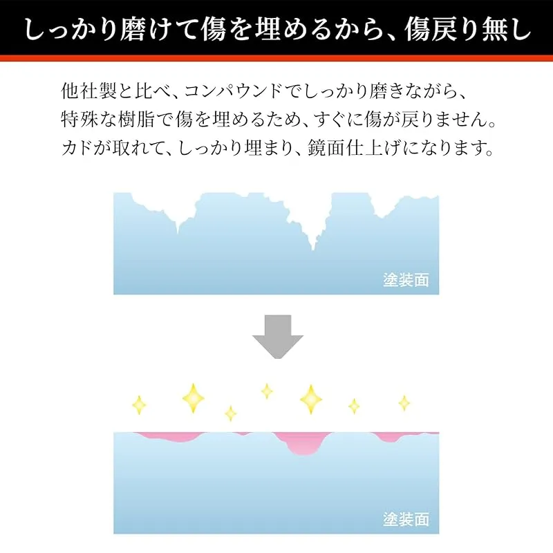 【商品概要】 BPRO(ビープロ)のキズ埋めコンパウンドは、1本で傷消しから鏡面仕上げができる車用研磨剤です。オールカラー対応、手磨きやポリッシャーで利用することができます。 1本で傷消しから鏡面仕上げまで:BPRO(ビープロ)のキズ埋めコンパウンドは、1本で傷消しから鏡面仕上げができます。オールカラー対応、手磨き・ ポリッシャーの両方で利用できます。 しっかり磨けて傷を埋めるから、傷戻り無し:他社製と比べ、コンパウンドでしっかり磨きながら、特殊な樹脂で傷を埋めるため、すぐに傷が戻りません。カドが取れて、しっかり埋まり、鏡面仕上げになります。 簡単施工:使い方も簡単!コンパウンドを塗り込んで、拭き取るだけの簡単施工です。
