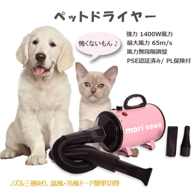 【商品概要】 製品仕様 電圧:100V(AC) 消費電力:1400W 風力:20~65m/s 温度調整:30~55℃ 本体サイズ:約39×20×17.5cm 重量:3.86kg ホース長さ:81~200cm(伸縮可能) カラー:ブラック、ブルー、ピンク 付属品:本体、ノズル×3、ホース×1、説明書×1 PSE適合品 1. 風量&温度の無段階調整 ペット専用設計で大風量!風量調整ボタンを使って無段階で風量を調整できます。温度は30~55℃に設定可能で、季節を問わず快適に使用できます。 2. 3種類のノズル付属 乾かす部位に合わせてノズルを使い分けることで、効率的なドライが可能です。 細口ノズル:全身用。体全体を素早く乾かせます。 幅広ノズル:汎用タイプで仕上げに最適。 丸形ノズル:手足などの細かい部分を乾かすのに適しています。 3. 伸縮可能ホースで使いやすい ホースは最大200cmまで伸ばせるので、自由自在に動かせます。スタンドを使えば、両手でブラッシングしながら乾かすことも可能です。ホースが外れた場合も簡単に取り付け直せます 4. 毛詰まりを防ぐフィルター付き 本体後部にフィルターを搭載。カバーを外して簡単に取り外せるので、お手入れがラクラク。定期的な清掃で故障のリスクを軽減し、長く使えます。