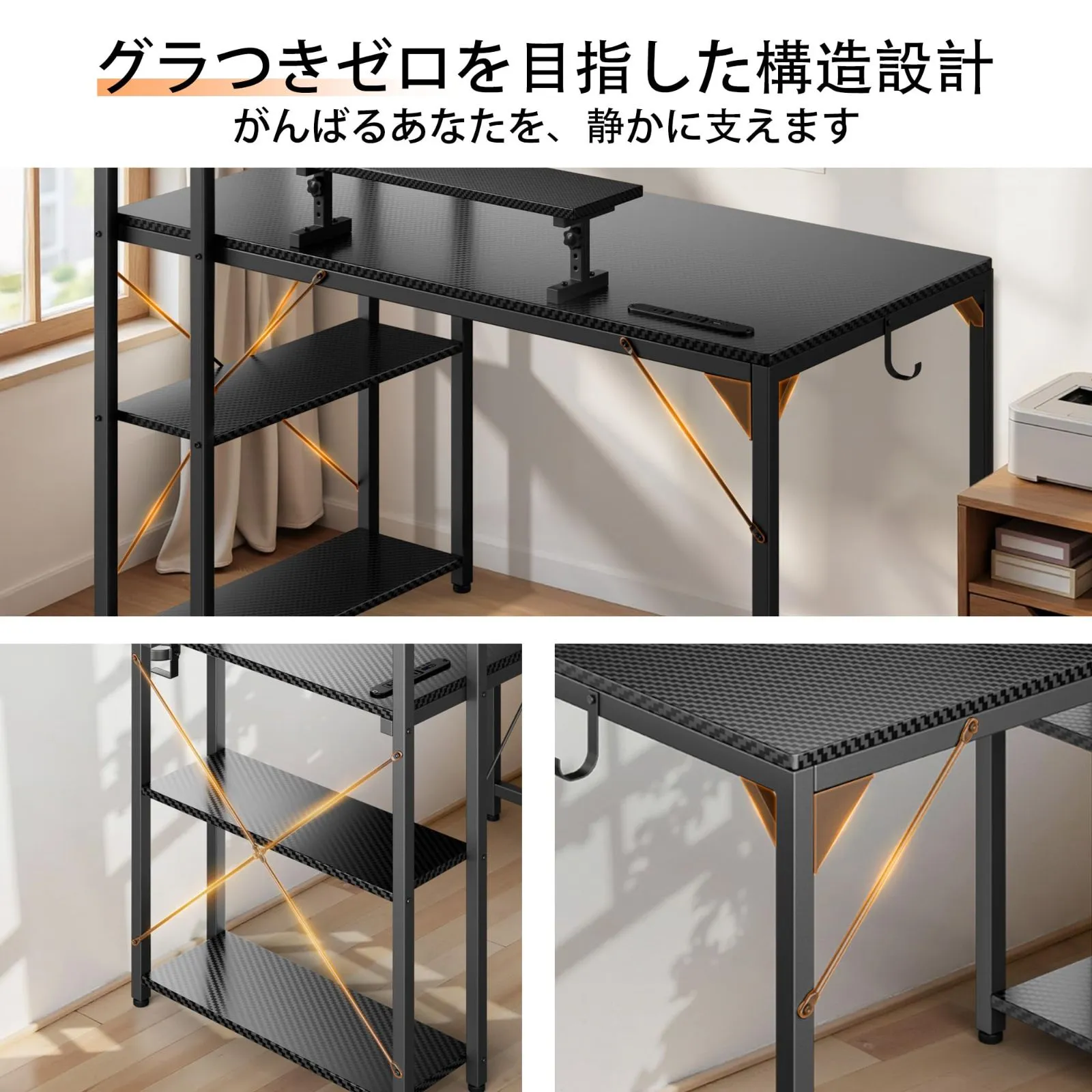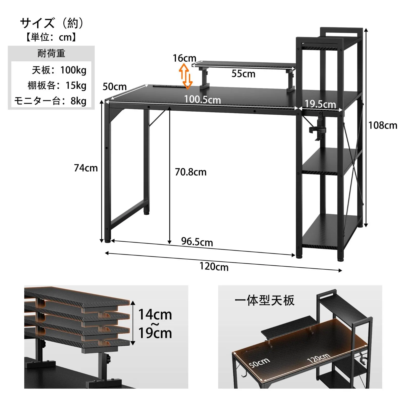 ゲーミングデスク コンセント付き 幅120CM 棚付き 収納 モニター台付き パソコンデスク pcデスク オフィスデスク 学習机 作業机 computer desk おしゃれ 組立簡単 黒