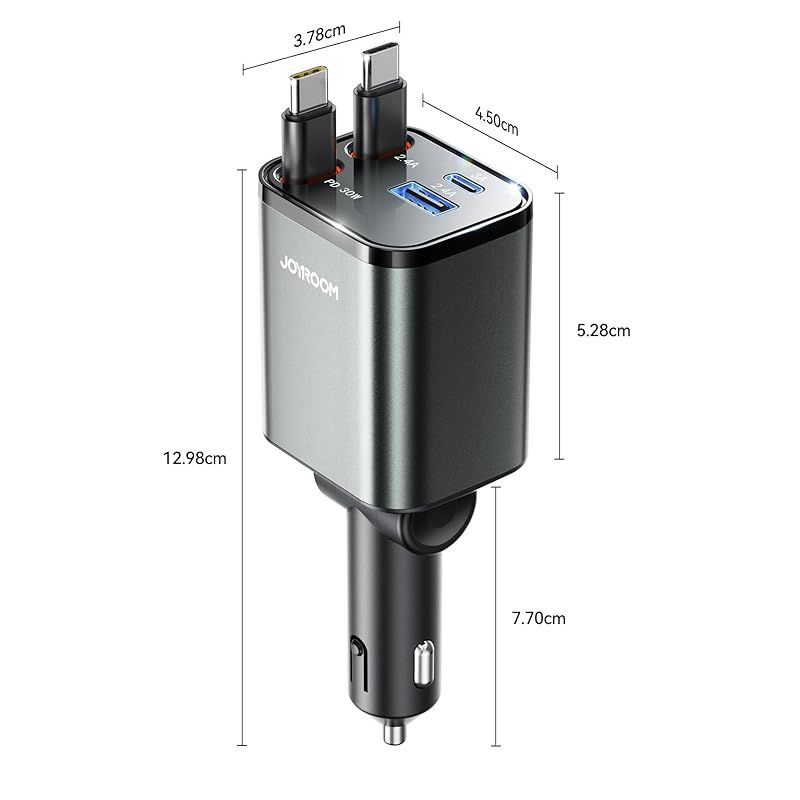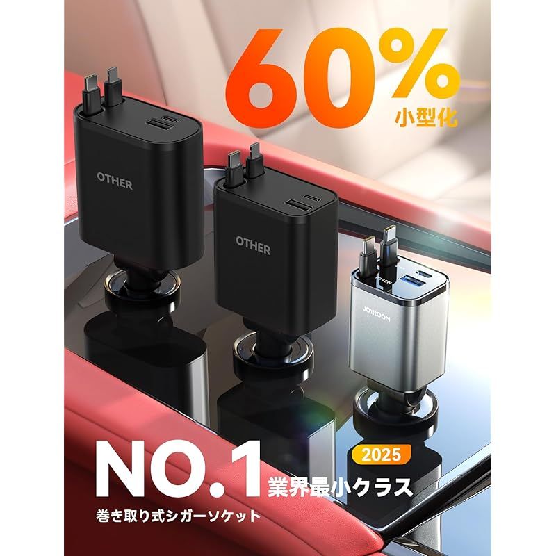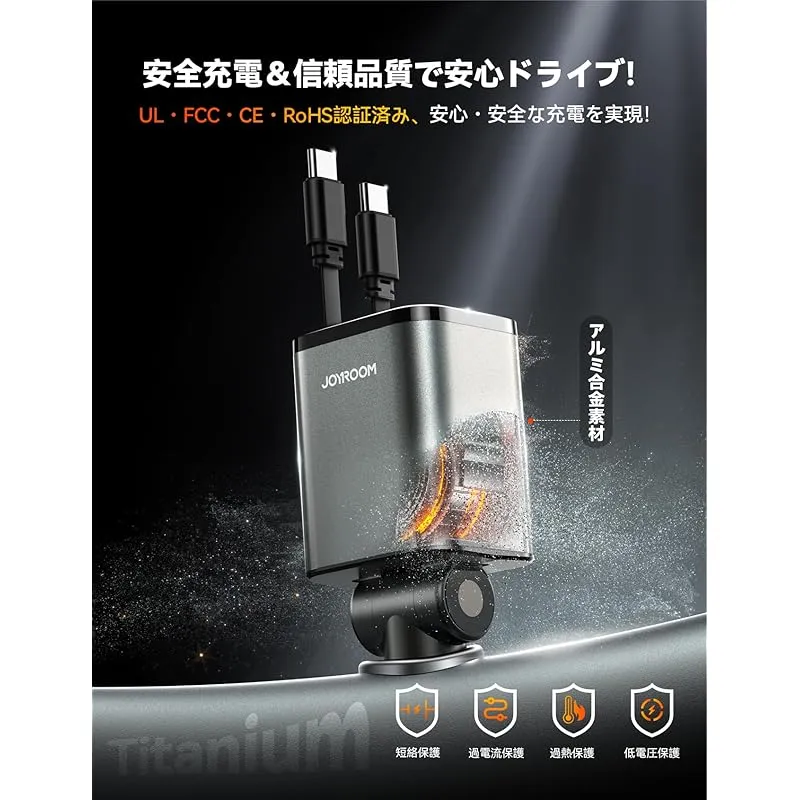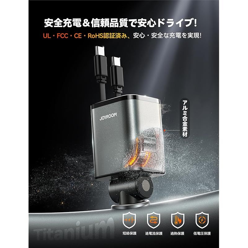 【巻き取り式・2本USB-C】JOYROOM 車載充電器 巻き取り式充電ケーブル 車 シガーソケット 69W