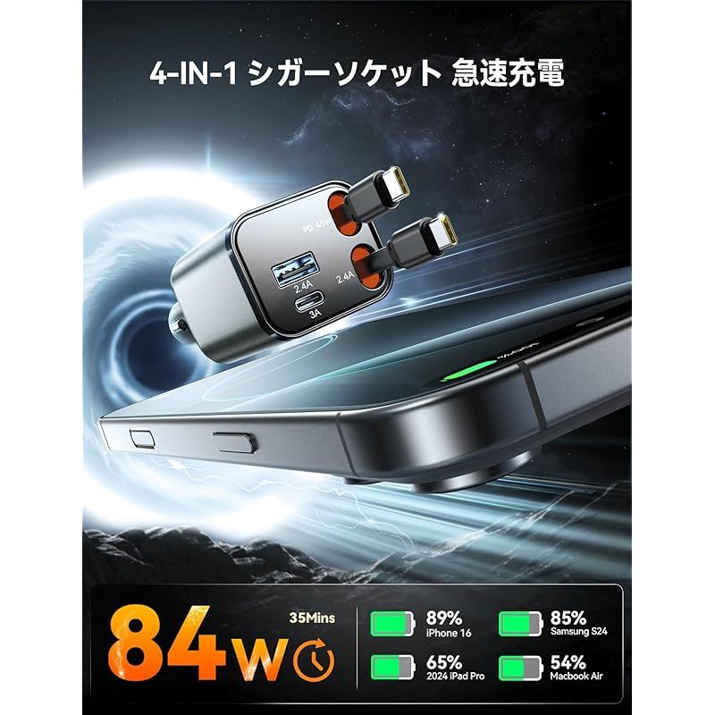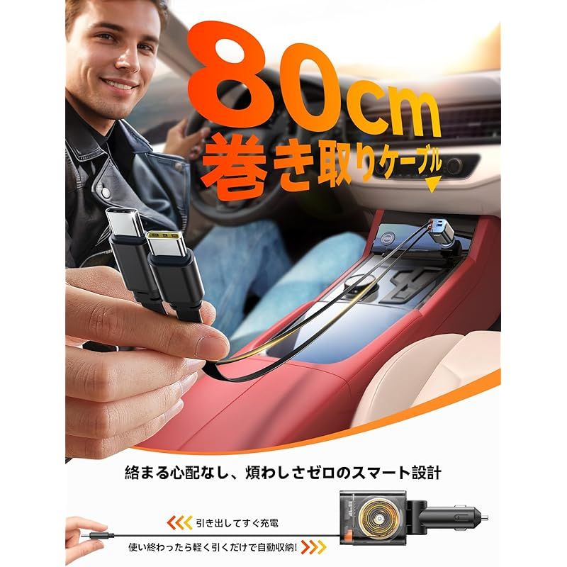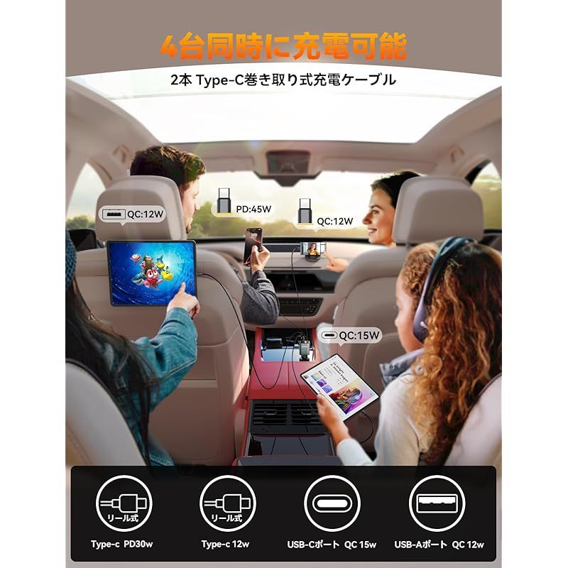 【4ポート同時充電|最大66Wのパワフル出力】 **4台同時充電対応!**本製品は、2本のType-C巻き取りケーブル+USB-Cポート(QC15W)+USB-Aポート(QC12W)を搭載し、最大66Wの急速充電を実現。Type-C PD30WポートはMacBook Air、iPad、Galaxy S23 Ultraなどのデバイスにも対応し、車内での充電ストレスをゼロに!