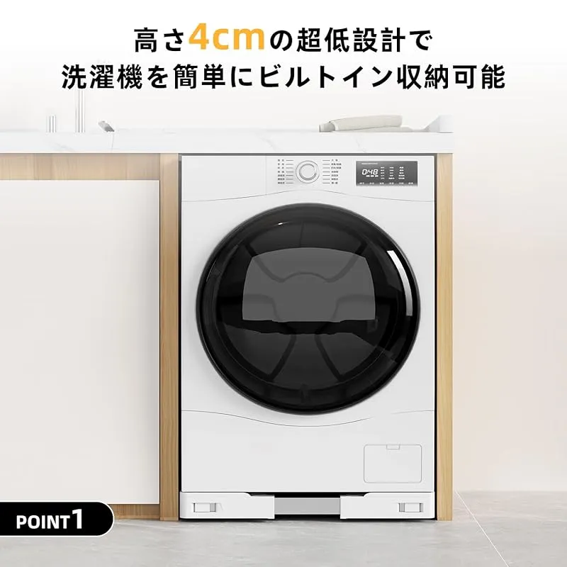 【超薄型設計でどんな環境にも対応】本製品は、わずか4cmの超薄型デザインを採用しており、限られたスペースにもスムーズに設置が可能です。内嵌構造により、洗濯機や乾燥機をセットしても見た目がすっきり整い、インテリアにも馴染みます。また、高品質なステンレス鋼とABS樹脂を使用し、優れた安定性と耐腐食性を実現しました。360度のスムーズな移動が可能で、最大150kgまでの耐荷重性能を誇ります。さらに、洗濯機や冷蔵庫との接触を防ぎ、排水や清掃の問題も簡単に解決します。 ??