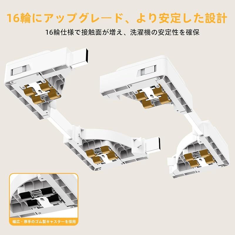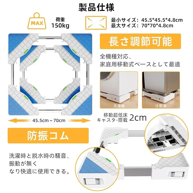 【製品説明】 この洗濯機底座は、家庭のニーズに応えるために設計された高性能な製品です。以下の特長により、日常生活をより快適にします: 1. 超薄型内嵌デザイン わずか数センチの超薄型設計により、設置後もすっきりとした見た目を実現します。狭いスペースにも対応し、洗濯機や乾燥機を美しく配置できます。 2. 隠しキャスター&360度回転 底部には隠し型のキャスターを採用し、360度の自由な回転が可能。移動が滑らかで簡単なだけでなく、見た目も洗練されています。掃除や位置調整も手軽に行えます。 3. 長さ伸縮自由で多機種対応 幅45.5cmから70cmまで伸縮可能なため、小型から大型までさまざまな洗濯機や乾燥機に対応します。機種変更後も引き続き使用可能で、買い替えの手間が省けます。 4. 静音・防振設計 耐久性のある防振パッドを装備し、洗濯や脱水中の振動や騒音を効果的に抑制。洗濯機の安定性を保ち、周囲への影響を最小限に抑えます。 5. 耐荷重150kgの頑丈構造 高品質なステンレス鋼とABS樹脂を使用し、最大150kgの耐荷重性能を実現。大型ドラム式洗濯機や重い家電も安心して支えることができます。