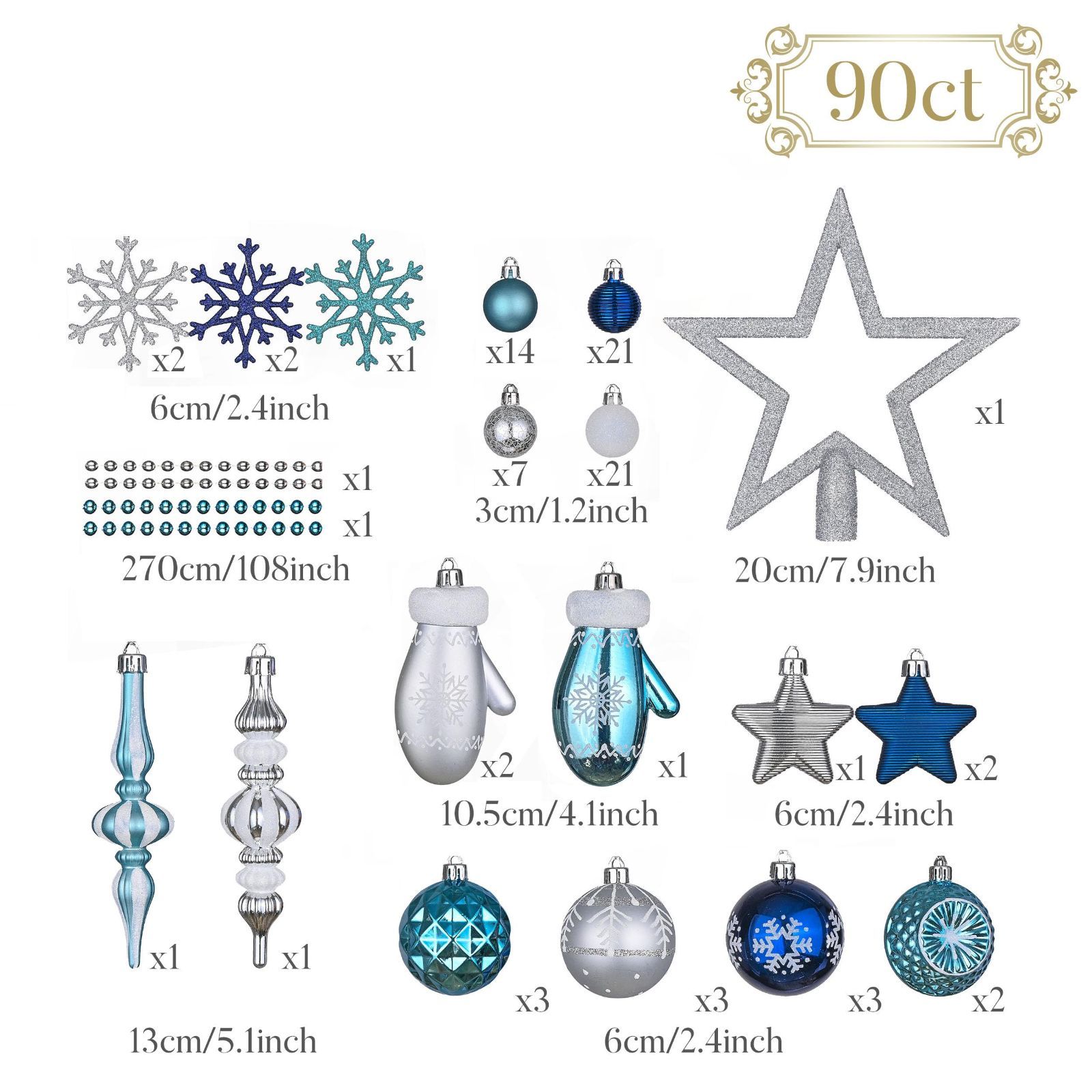 【パッケージとサイズ】クリスマスオーナメントセットには、銀、青、白のクリスマスボール90個が含まれています。各ボールはシームレス接続を採用し、洗練された外観を作り出しています。ボックスには高品質のエコボール箱を採用し、贅沢感を加えます。