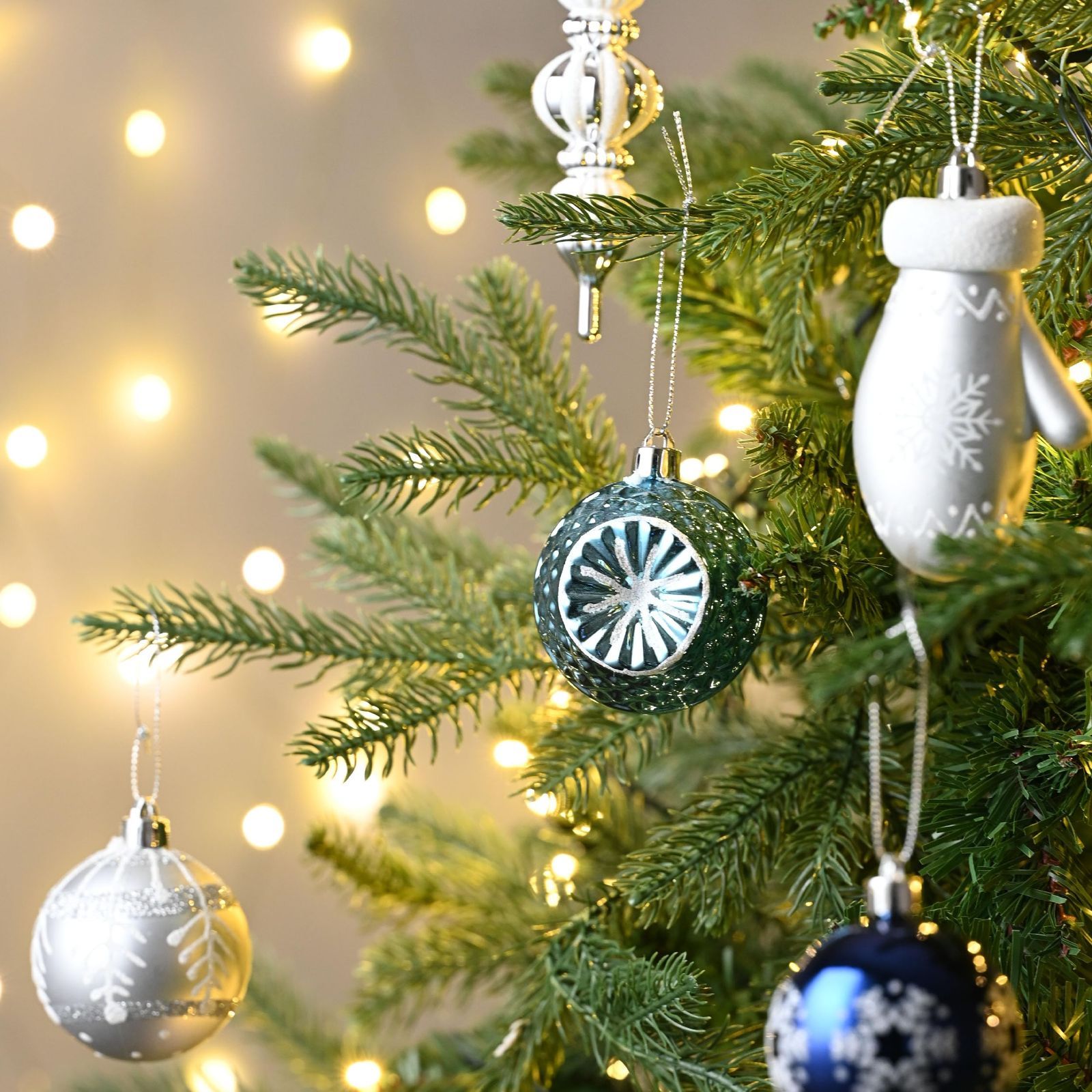 【色合わせ】クリスマスボールオーナメントは3つの独特な表面処理(光沢、マット、グリッター)を施されます。表面には異なる精緻なテクスチャがあります。それぞれのボールは丹念に吹き込まれ、手作業で塗装されています。ボールは海のシルバーとブルーといった淡い色合いが多く、クリスマスツリーの深いグリーンにお互いに美しく映えます。