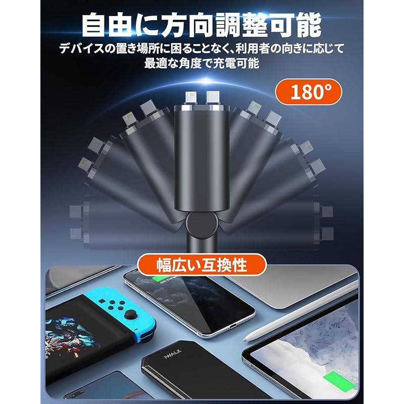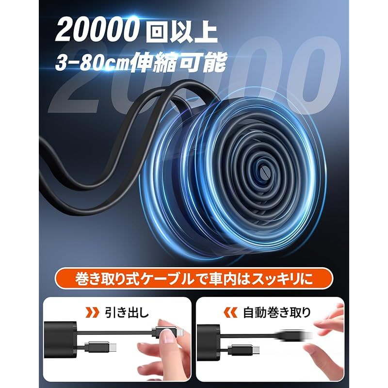 【巻き取り式・自由に方向調整可能】巻き取り式充電ケーブル は3cmから80cmまで自在に伸縮でき、前後座席の方々も快適に充電が可能です。車 充電器は 180 度調整可能で、デバイスの置き場所に困ることなく、最適な角度で充電が可能です。