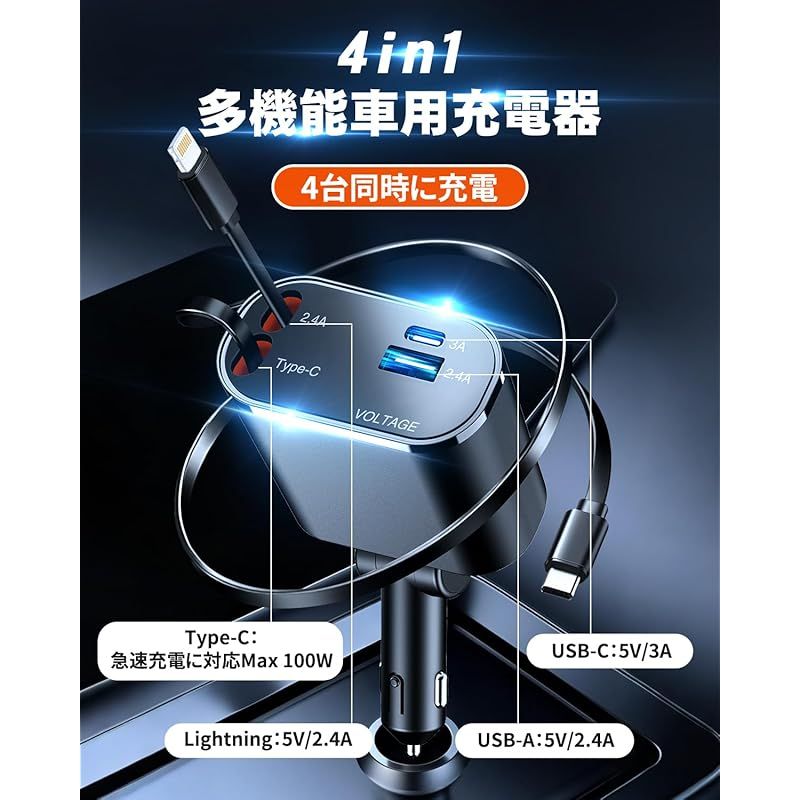 【4in1 シガーソケット・ 4台同時に充電】シガーソケットには 2本の巻き取り式ケーブル(lightning:5V/2.4A、 Type-C:100W)と2つのUSBポート(USB-C:5V/3A、USB-A:5V/2.4A)を備え、4台のデバイスを同時に充電できます。この巻き取り式 シガーソケットにより、愛車はいつもすっきりに。