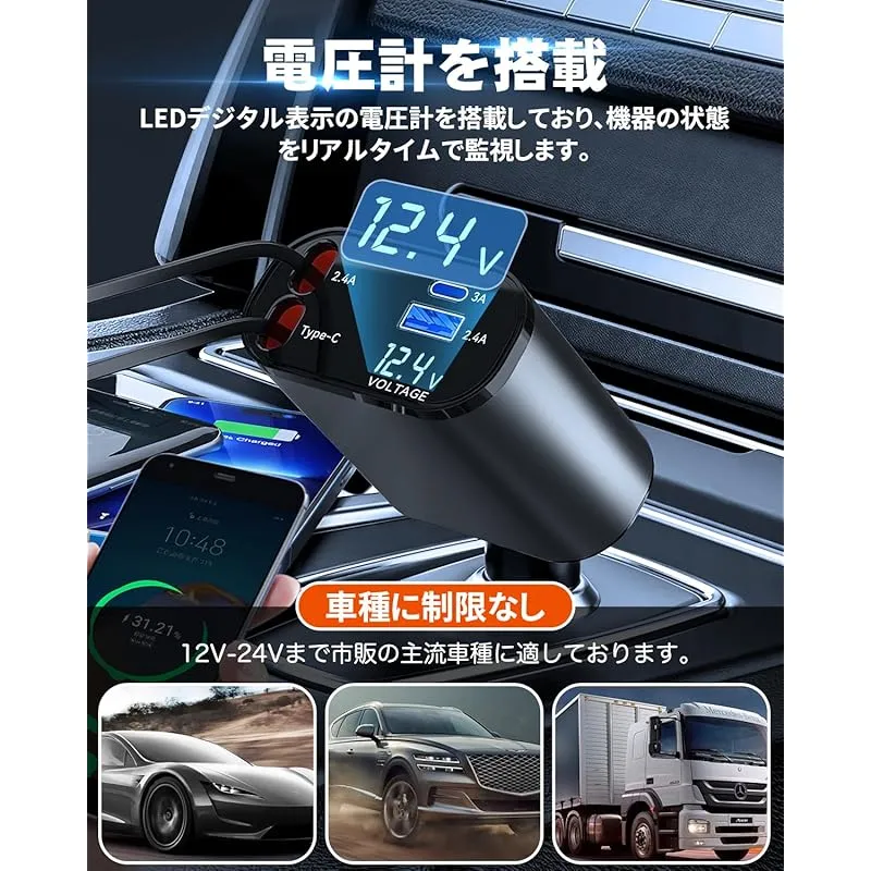 【電圧計を搭載 安全保障】シガーソケット にはLEDデジタル表示の電圧計を搭載しており、車のバッテリー状態をリアルタイムで監視することができます。過電流保護、高温保護、過電圧保護、短絡保護、過充電保護など安全保障も付き安心に運転できます。