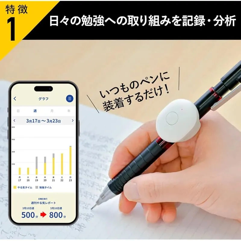 【商品概要】 いつものペンにセットするだけで、勉強への取り組みを記録・分析。 対応する筆記具 シャーペン・ボールペン・スタイラスペン等 ※対応する筆記具のサイズ目安:直径9~13 ※通常の鉛筆(直径8mm以下)には装着できません 対応OS:iOS11以上 Android 7.0以上 本体重量 約8g サイズ 本体:24×30×22mm 充電ケース:51×51×35mm 充電方法 本体:ケースで充電 充電ケース:USBで充電(USB Type-C) ※USBケーブルは付属していません バッテリー時間 約7日間(1日2時間の学習を想定) 本品は、日本国内仕様です。海外の規格には対応していません。