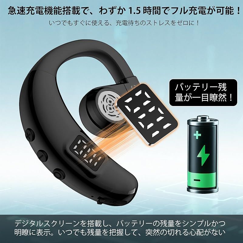 【LEDディスプレイ&物理式 ボタンブルートゥース イヤホン 片耳】このBluetooth マイク付きイヤホンはLEDディスプレイも付き、高精細と高級感溢れて、バッテリー残量はディスプレイに数字で表示され、一目瞭然です。このマイク付きイヤホンの特徴は、耳を塞がず設計です。これにより、周囲の音も聞こえる使い勝手と、長時間使用しても耳への負担が少ないメリットがあります。着信する時、音楽再生/一時停止、次/前の曲へ切り替える、通話開始/終了/拒否などの操作を全て簡単に実現可能、ワンボタンで片手でも操作可能です。煩わしいケーブルの拘束から解放!