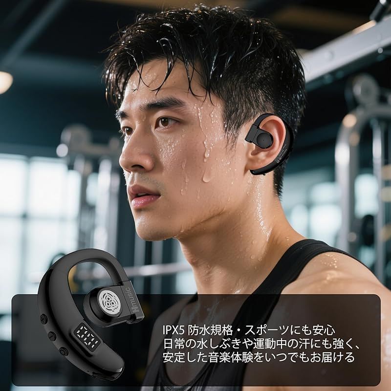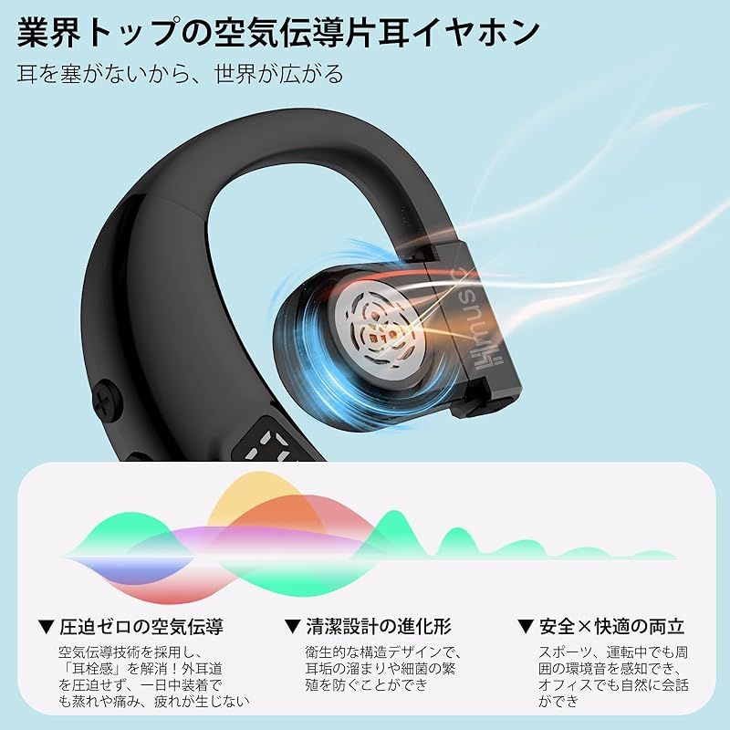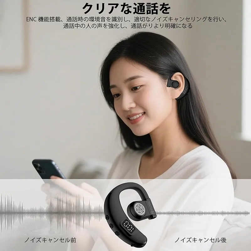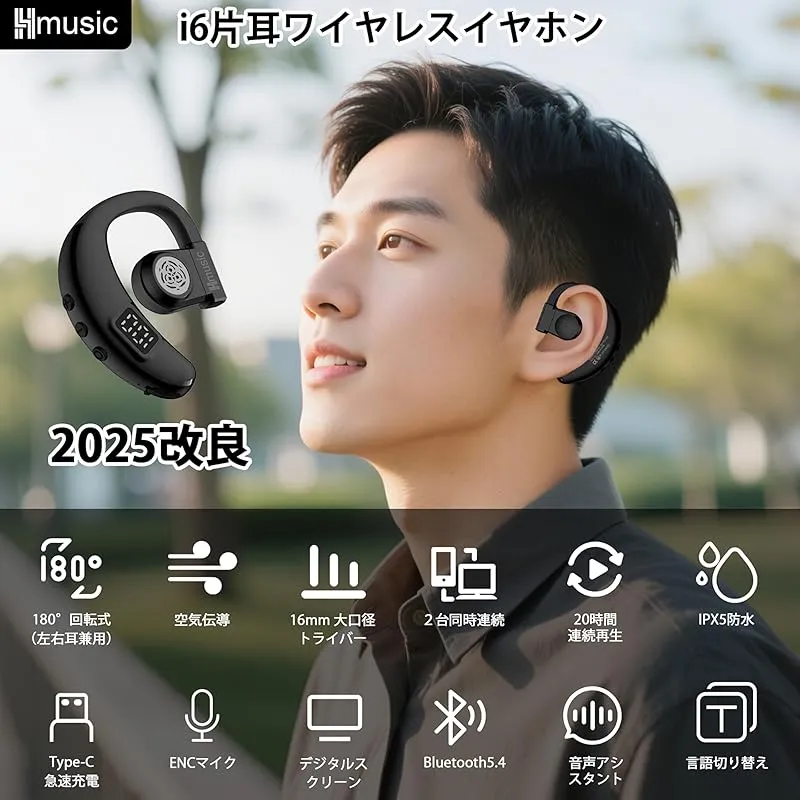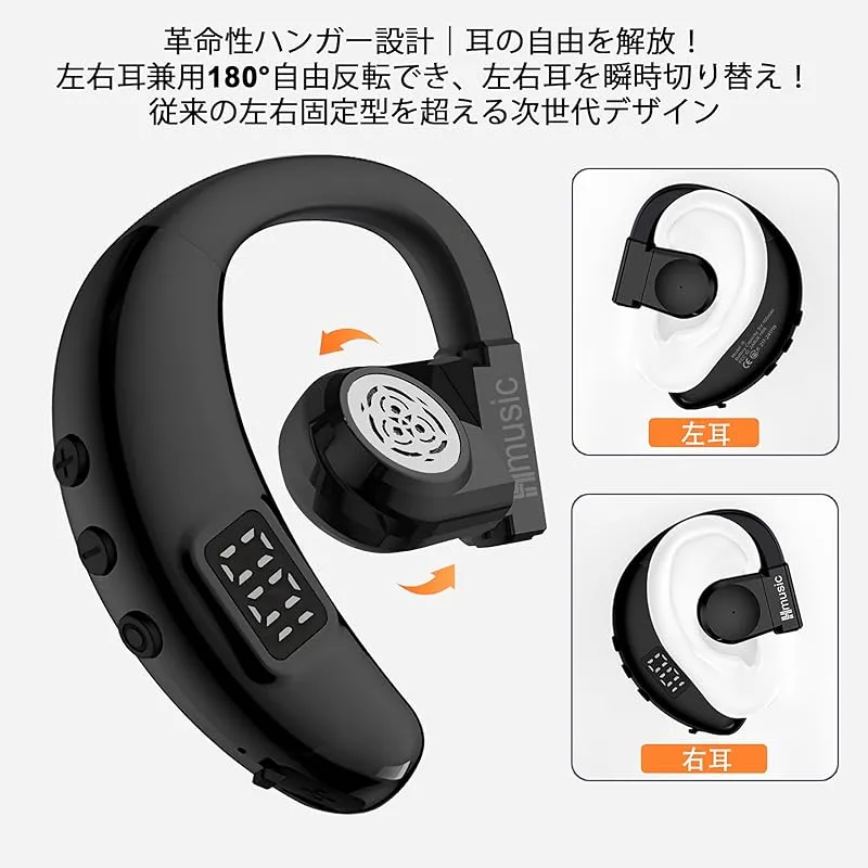 Hmusic 片耳イヤホン Bluetooth5.4(日本語音声と左右耳兼用)耳掛け式ぶるーとゅーす イヤホンENCマイク付き ハンズフリー通話 IPX5防水 Type-C急速充電 20時間再生 LEDバッテリー残量表示 物理ボタン 自動ペアリング 瞬時接 0