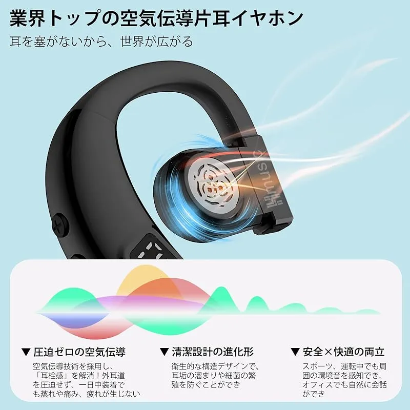 【LEDディスプレイ&物理式ボタンぶるーとゅーす イヤホン】このBluetooth マイク付きイヤホンはLEDディスプレイも付き、高精細と高級感溢れて、バッテリー残量はディスプレイに数字で表示され、一目瞭然です。このマイク付きイヤホンの特徴は、耳を塞がず設計です。これにより、周囲の音も聞こえる使い勝手と、長時間使用しても耳への負担が少ないメリットがあります。着信する時、音楽再生/一時停止、次/前の曲へ切り替える、通話開始/終了/拒否などの操作を全て簡単に実現可能、ワンボタンで片手でも操作可能です。煩わしいケーブルの拘束から解放!
