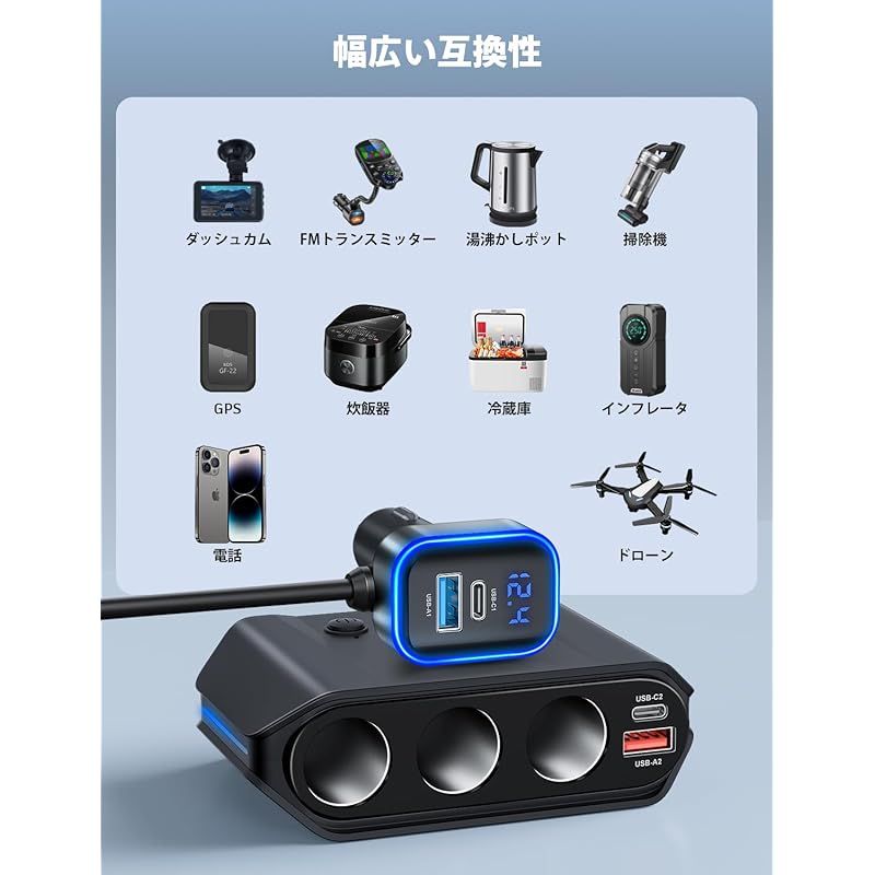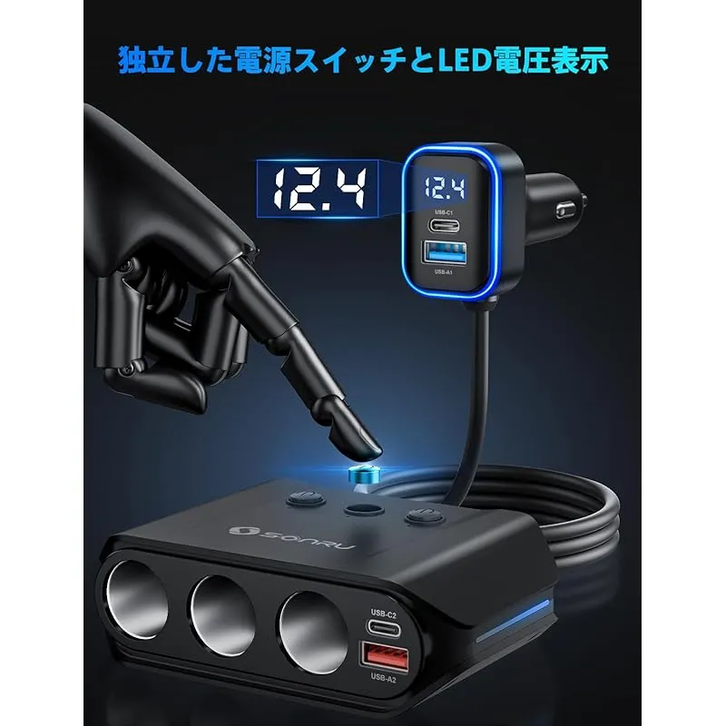 【商品概要】 180W シガーソケット3連 4ポ:SONRU シガーソケット増設分配器 は、4 つの充電ポートと 3 つのシガレット ライター スプリッター ソケットを備え、合計 180W を供給します。カー チャージャー アダプターは、12V/24V 車両で 7 つのデバイスを同時に素早く充電でき、GPS、ダッシュ カム、掃除機、カー 冷蔵庫、FM、エア ポンプなどに適しています。(1 つのソケットの電力は 120W を超えません。) 2 PD30W/2QC 3.0超高速充電:車の USB 充電器マルチポートは、デュアル USB-A ポート (5V/2.4A +18W) + デュアル USB-C ポート (36W/最大 45W(20V)+36W) で構成されています。USB-A2+USB-C2 は共有充電チップです。2 つのポートを一緒に使用すると、合計電力は 5V/3A になります。単独で使用する場合、USB-A2 ポートは QC3.0 18W 急速充電出力をサポートします。USB-C2 は最大 PD36W をサポートします。内蔵のスマート チップは自動的に電流を識別して分配し、同期急速充電を実現し、後部座席にさらに多くの充電ポートを提供します。 独立した電源スイッチ& LED 電圧表示:このシガーソケット3連、カー チャージャーには、シガレット ライター ソケットをそれぞれ制御する 3 つの独立したスイッチが装備されており、シガレット ライター デバイスのプラグを差し込んだり抜いたりする必要がありません。摩耗を減らし、機器の寿命を延ばします。SONRU シガレット ライター USB チャージャーには、車内の電圧出力をリアルタイムで監視できるインテリジェントな LED ディスプレイが付いています。車の電圧が 12V を下回ると、運転中に問題が発生するのを防ぐためにデジタル警告が点滅します。 複数の安全保護:12V/24 カーシガレットライターアダプターは、アルミニウム合金+ABS耐火材料で作られており、交換可能な15Aヒューズ(予備ヒューズx 2付き)が内蔵されており、過電流、過負荷、過熱、過電圧、短絡保護を提供します。SONRU USB Cカーチャージャーアダプターは、UL、CE、FCC、RoHSの公式認定を受けています。 品質: SONRU は 12 か月のサポートを提供します。この商品に問題がある場合は、お気軽にお問い合わせください。(内容物: シガレット ライター USB 充電器 1 個、ユーザー マニュアル 1 部、ベルクロ 1 個、予備ヒューズ 2 個) 幅広い互換性:当社の車用プラグインアダプターコンセントは、SUV、トラック、MPV、RV、オフロード車などの12/24V車で広く使用されています。さらに、USB Cカーチャージャーは、ノートパソコン、MacBook、iPad、Switch、Kindle、カメラ、iPhone、Huawei、Samsung、Xiaomi、LG、Sony、Androidフォンなど、ほとんどのUSB電源デバイスと互換性があります。