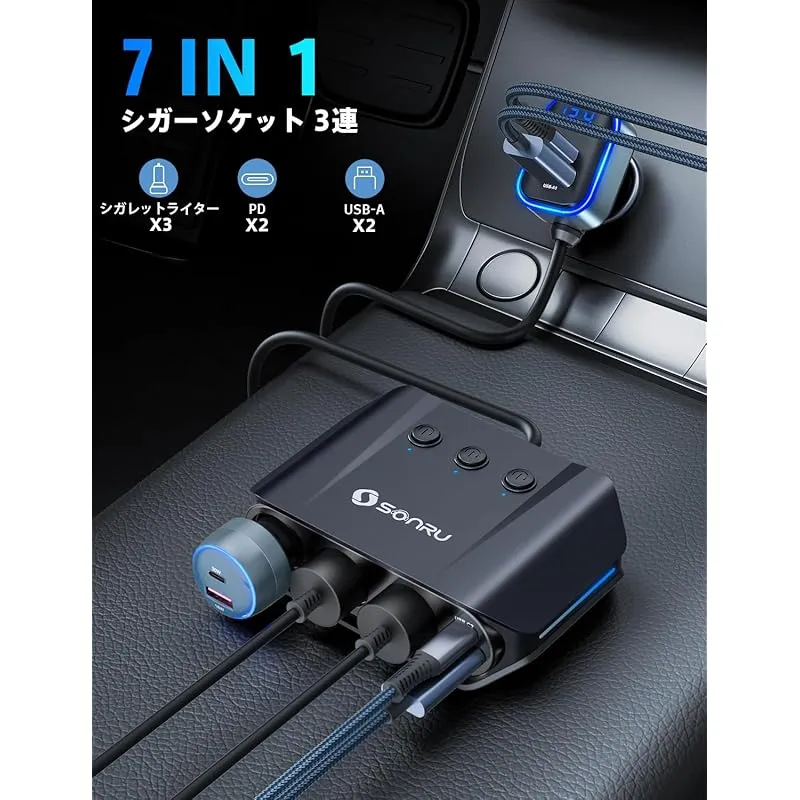【商品詳細】 ブランド:SONRU 商品種別:携帯電話用車載充電器 商品名:2025進化モデル SONRU 7 in 1 シガレットライタースプリッター、180W [デュアルPD & QC 3.0] カーチャージャーアダプター、12V/24V カーUSBアダプター マルチソケット 電圧計付き 急速充電 iPhone 16/15/14 製造元:SONRU 商品番号:C59-01 色:ブルー