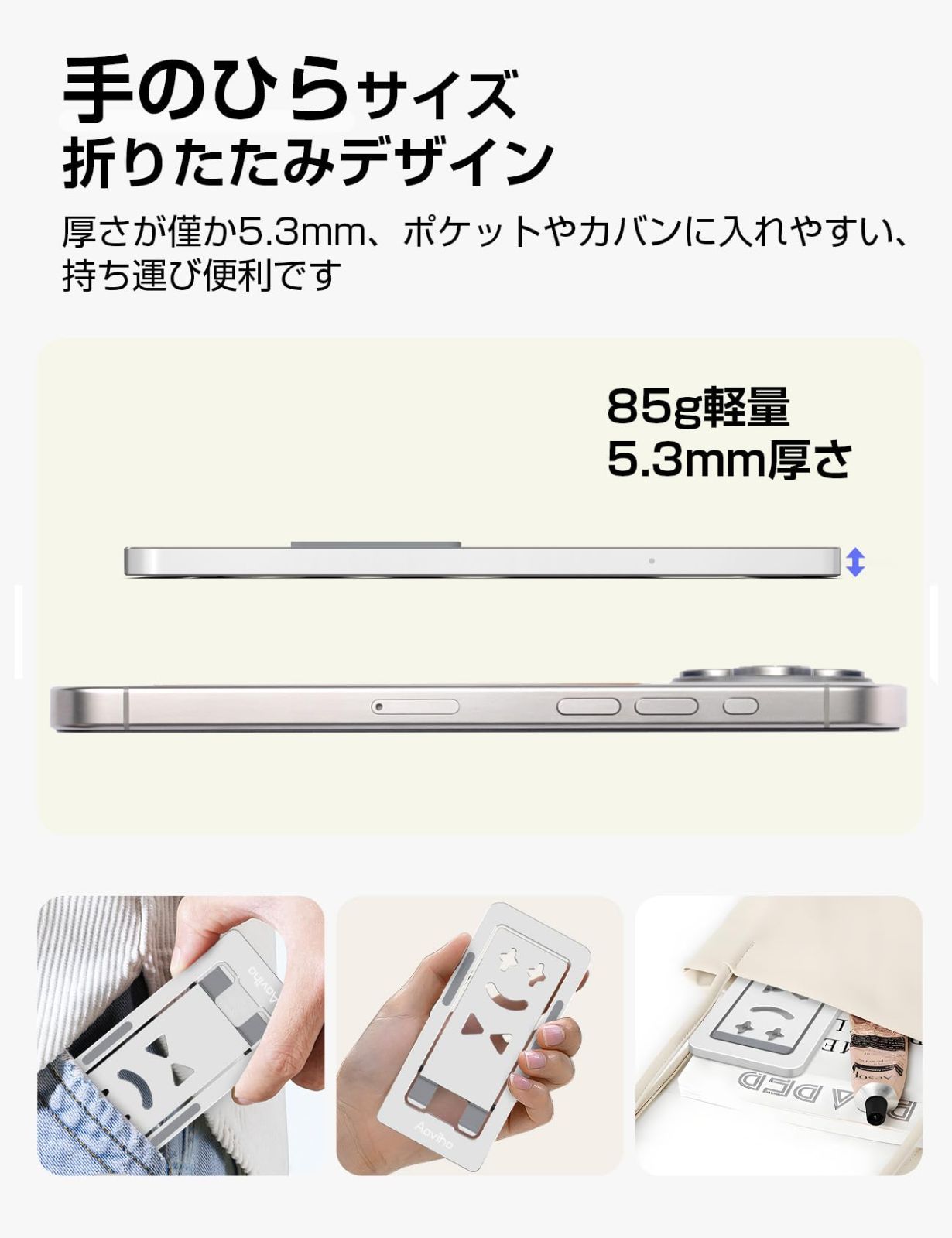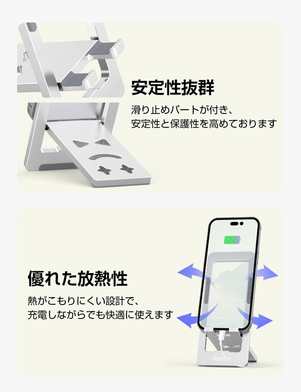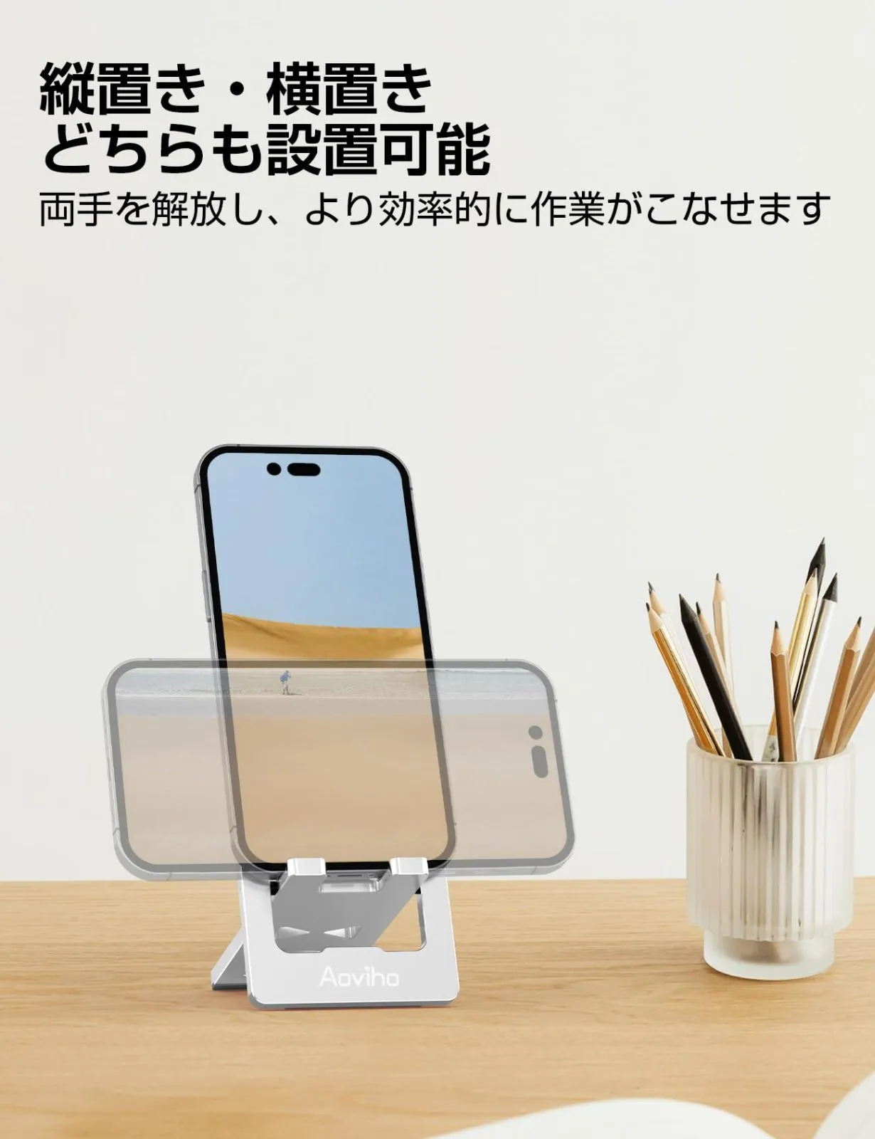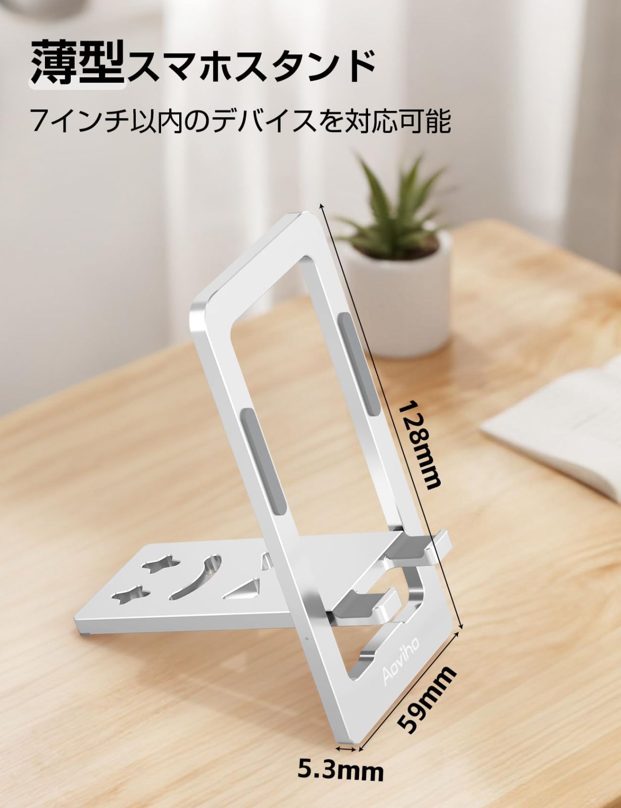 Aoviho(アオビホ) スマホスタンド 携帯スタンド卓上 薄型 スマホ立て 折り畳み iphoneホルダー phone stand 横縦置き台 アルミ合金製 角度調整 持ち運び便利 かわいい iPhone17 Air 16e 16 15 14Plus Pro Max 13 12minSamsungSONY XperiaAndroidなど7インチ以内のスマホに対応 (銀 シルバー)