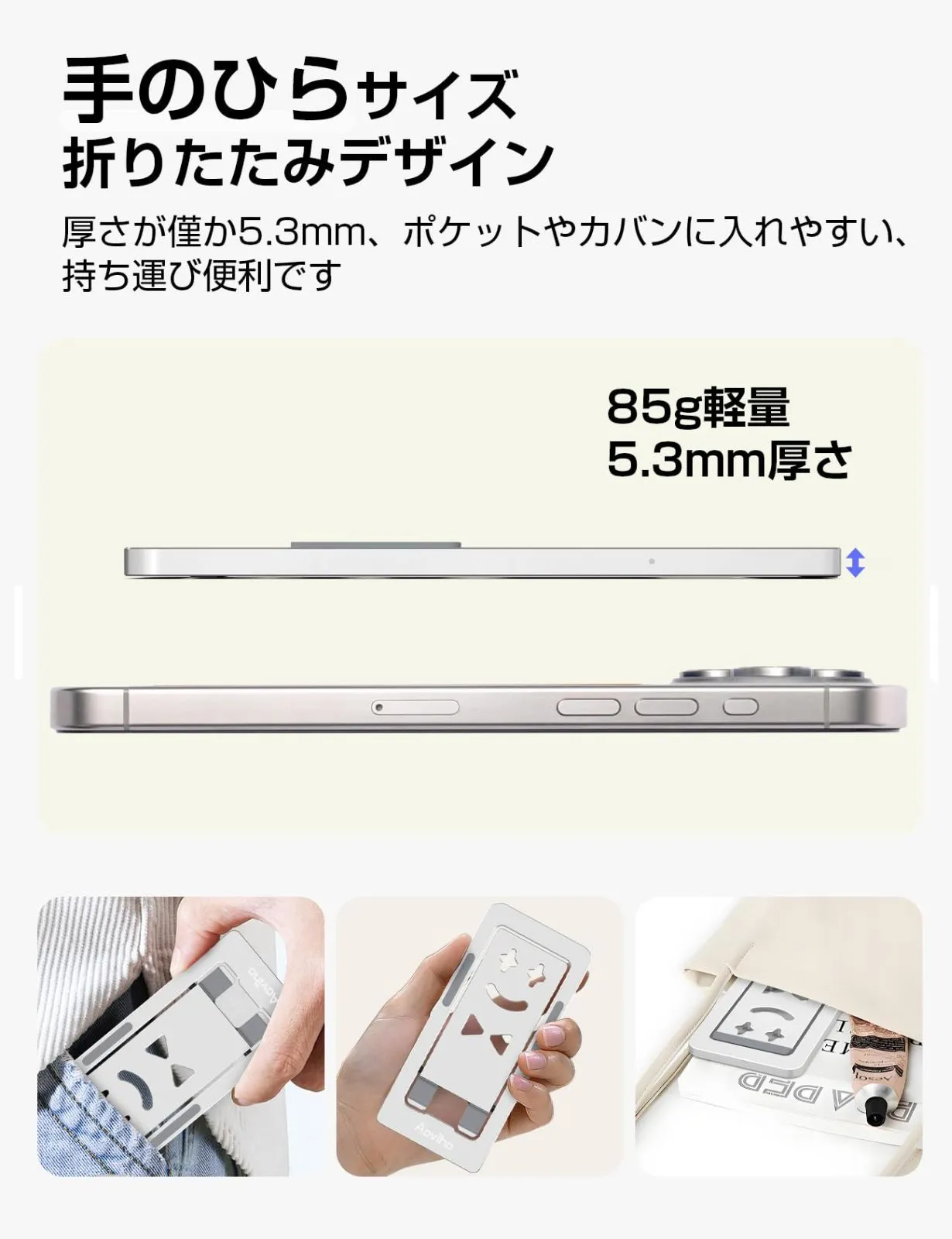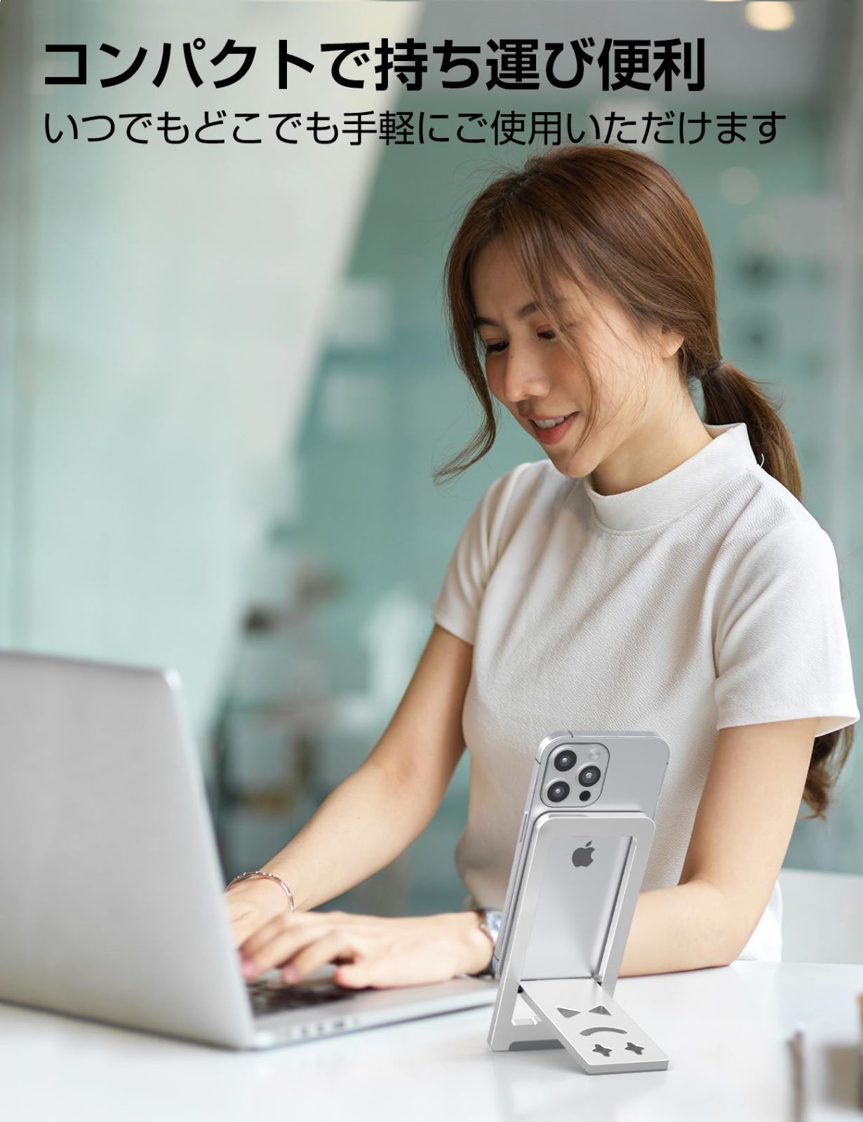 【幅広い対応性】この携帯スタンドは、軽量でフラットに折り畳めるため、持ち運びやすさと使いやすさを兼ね備え、日常の動画視聴や電子書籍の閲覧、オンライン会議など、幅広いシーンで活躍します。例えば、出張や旅行などの移動中でも、新幹線や飛行機内でサッとスタンドをセットして、両手を解放しながら快適に動画や映画を楽しめます。また、コンビニやレストランでの一時的な利用から、デスクワーク時のビジネスミーティングやビデオ通話まで、さまざまな用途に対応。スタイリッシュで機能的なデザインは、モバイルワーカーやフリーランスにもぴったりです。