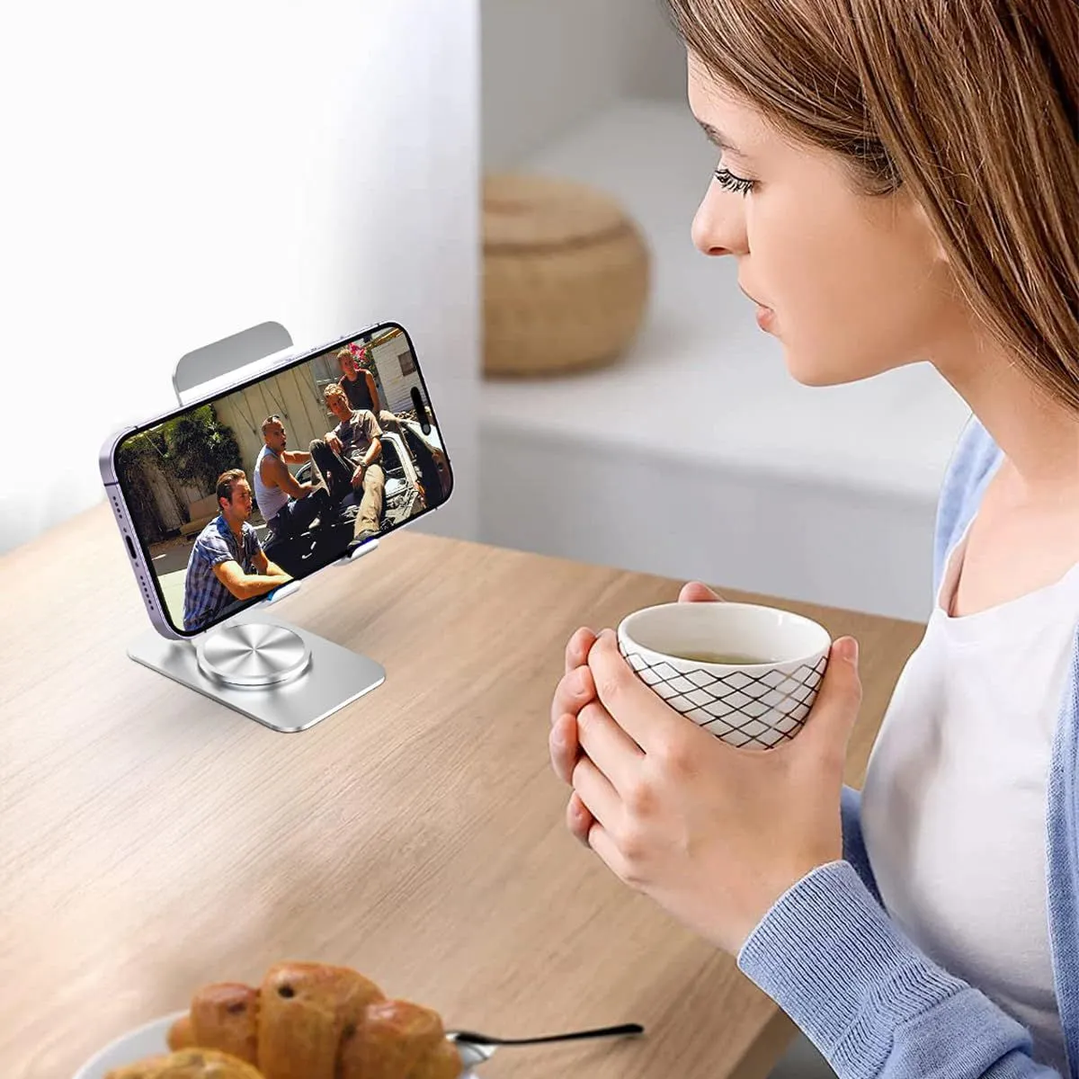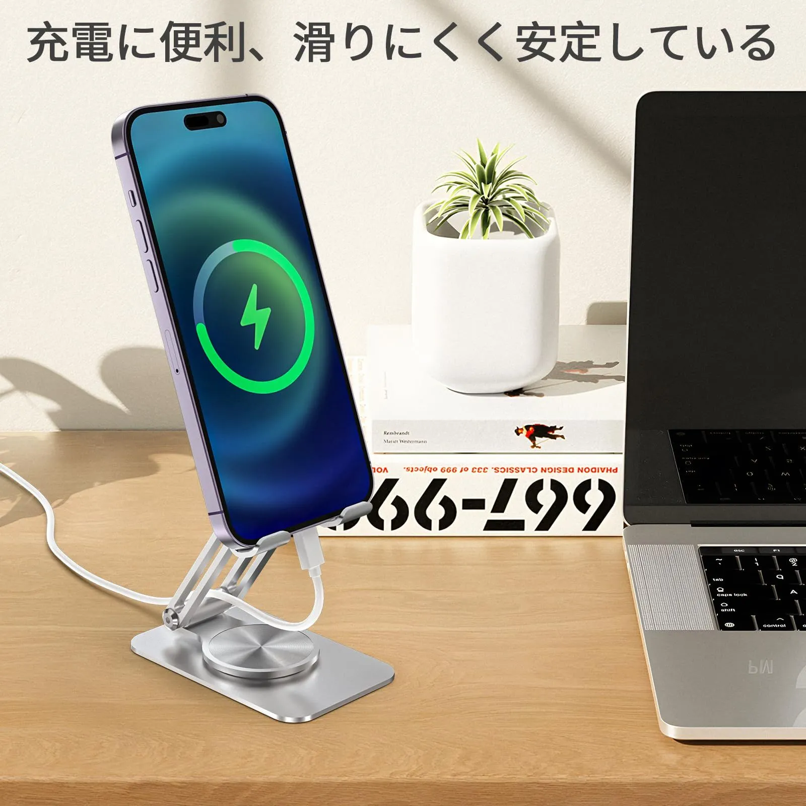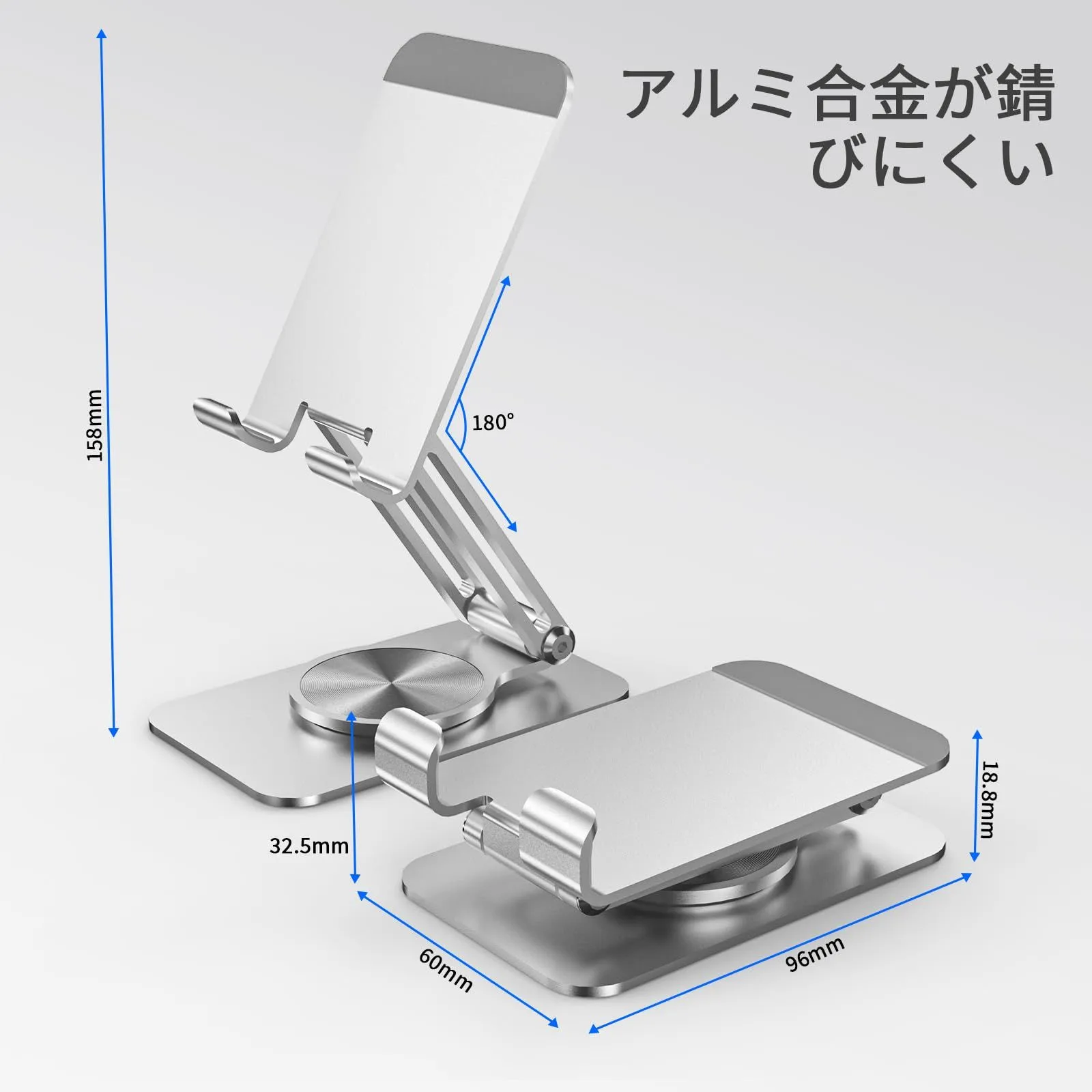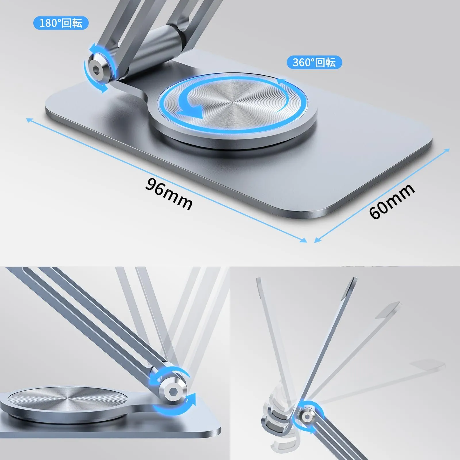 【360度回転式】スマホスタンド台座が360度回転するため、スマートフォンやアイフォンを載せたまま、見せたい向きに自由に回転させることができます。カチカチと軽めのいい音が出ながら回転してかなり高級感があります。姿勢を改善し、首、肩、背の疲労を和らげることができます。また、角度調整可能で、使用時に自分の快適な角度や高さを自由に調整できます。 折りたたみ高さ調節可能なスマホスタンド伸縮式スマホ スタンド 卓上 アルミ合金製無段階360度回転調整 iphoneスタンド 折りたたみ式 iPhoneシリーズ、/Androidスマホ対応 2024軽量化されたアルミ製携帯電話スタンド