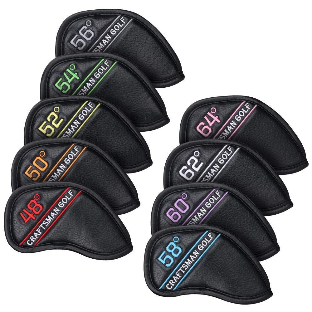 黒9枚 48°~64°(2°刻み) CRAFTSMAN(クラフトマン) ゴルフウェッジカバー アイアンカバー ヘッドカバー 9個セット(48°,50°,52°,54°,56°,58°,60°,62°,64°) カラフル数字刺繍 マジックテープ開閉 合成皮革 ブ