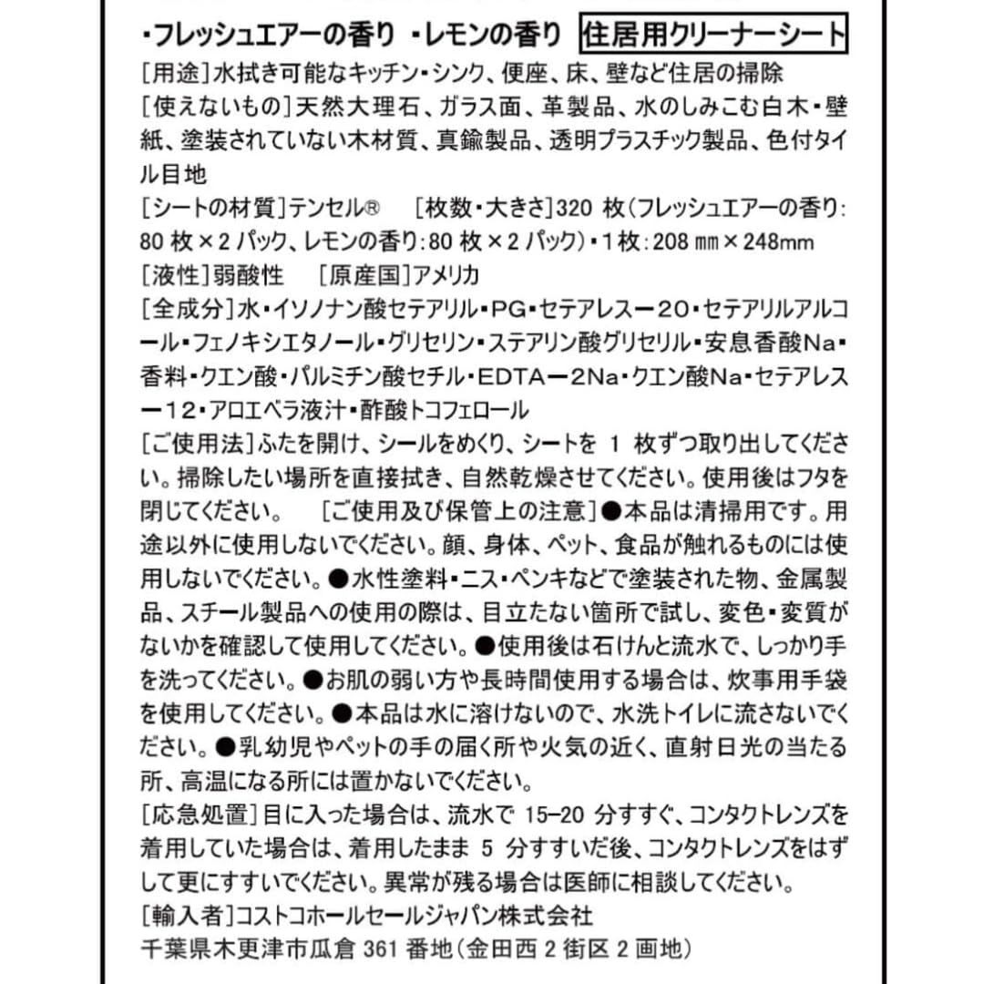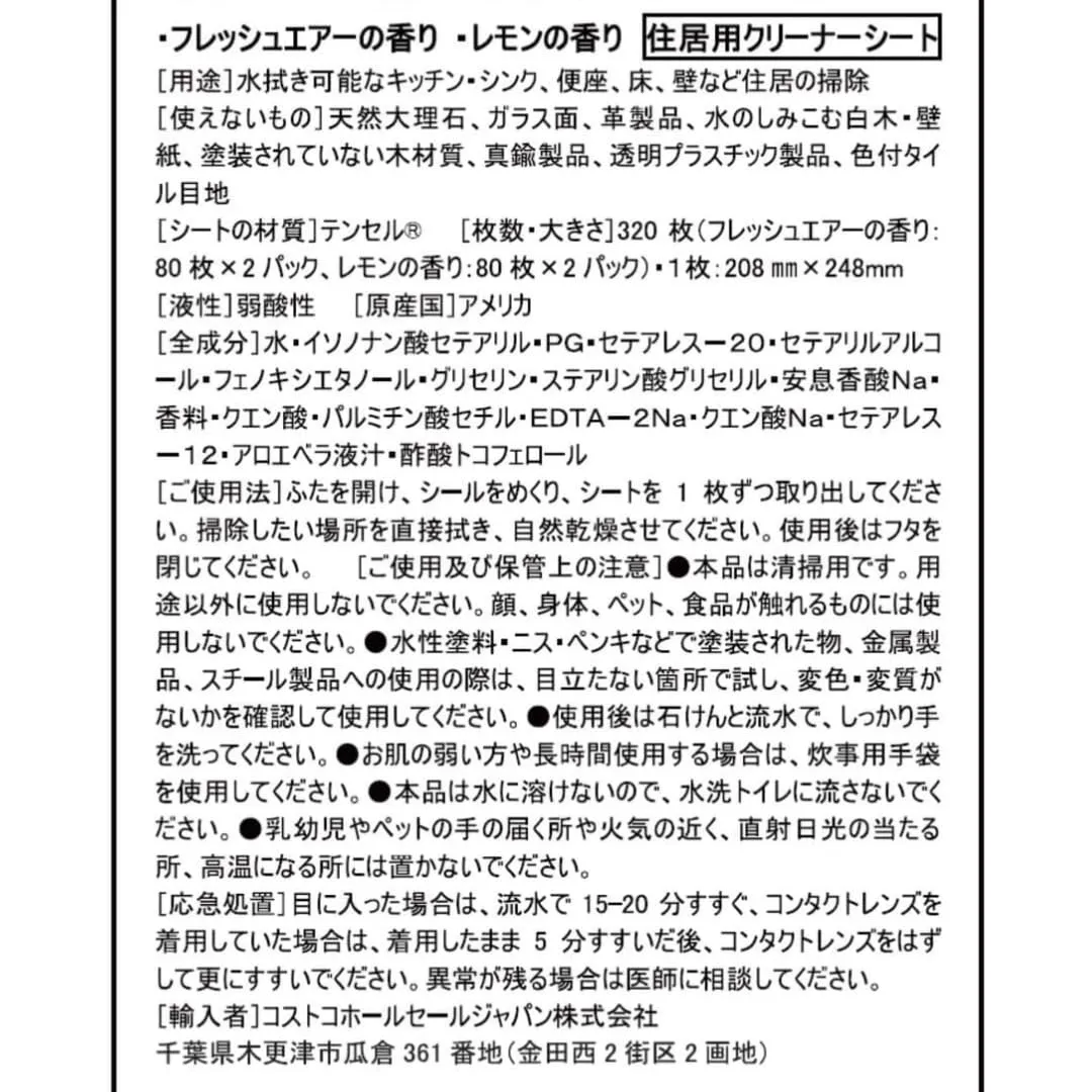サーフェスワイプブランド:コストコ香り:フレッシュエアーの香り(80枚×2)、レモンの香り(80枚×2)内容量:合計320枚シートサイズ:20.8cm ×
