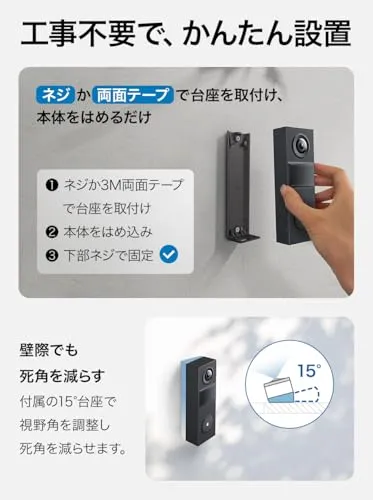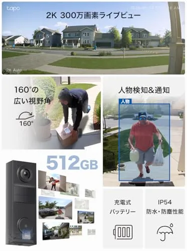 Tapo(タポ) スマートドアホン ドアホン 工事不要 インターホン ワイヤレス カメラ付きインターホン 2K 3MP 300万画素 IP54 防水防塵 双方向通話 ドアホンコール 人物検知 メーカー保証1年 TP-Link Tapo D205po