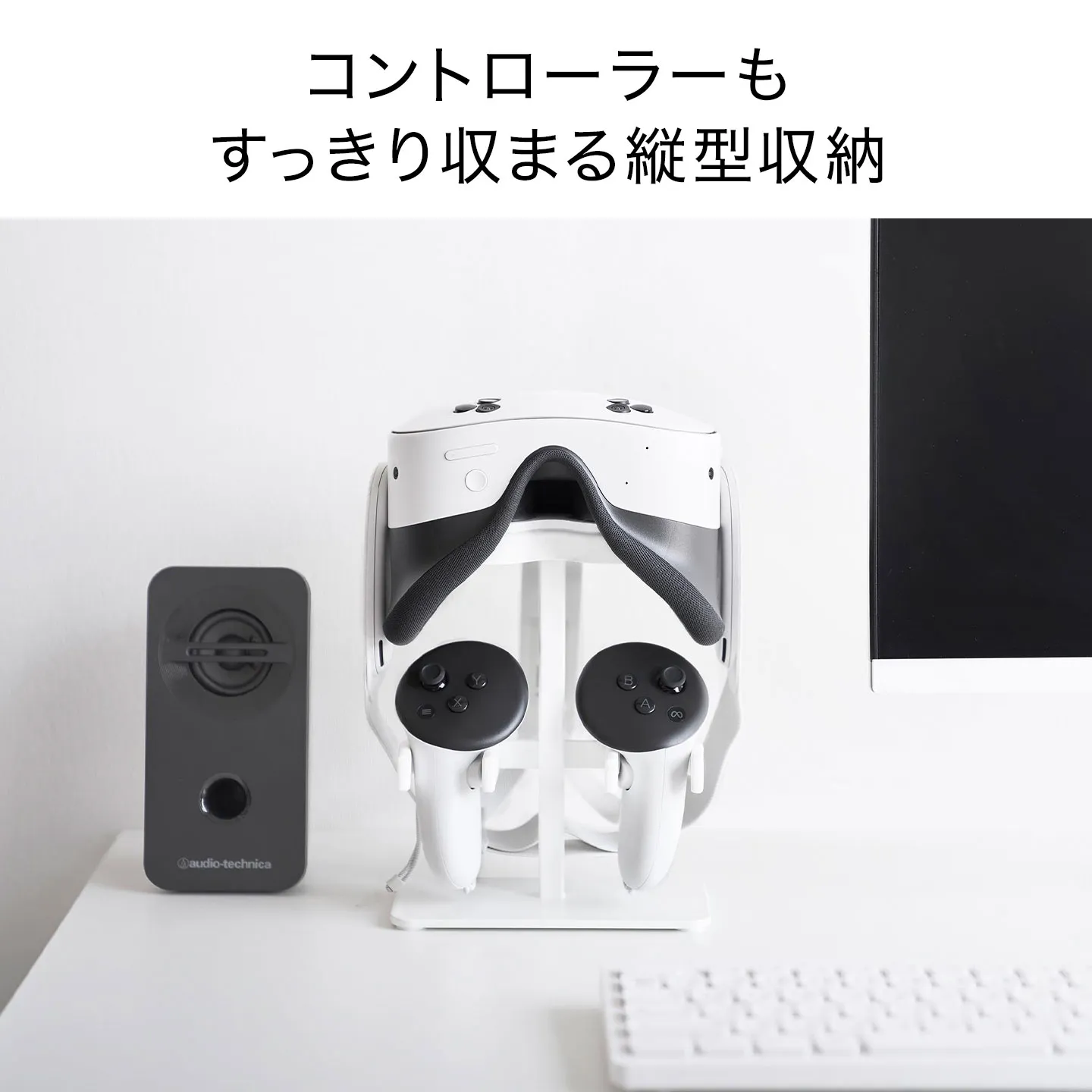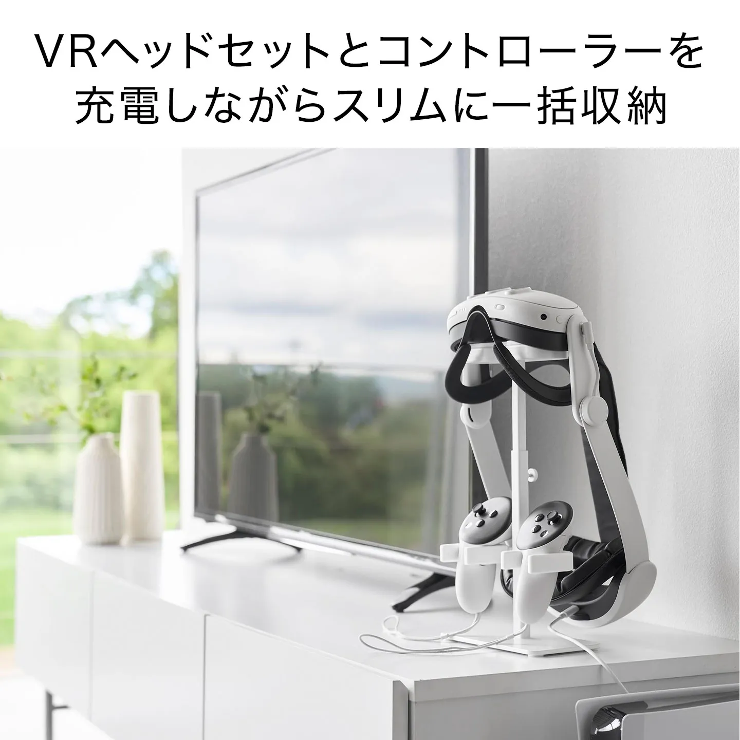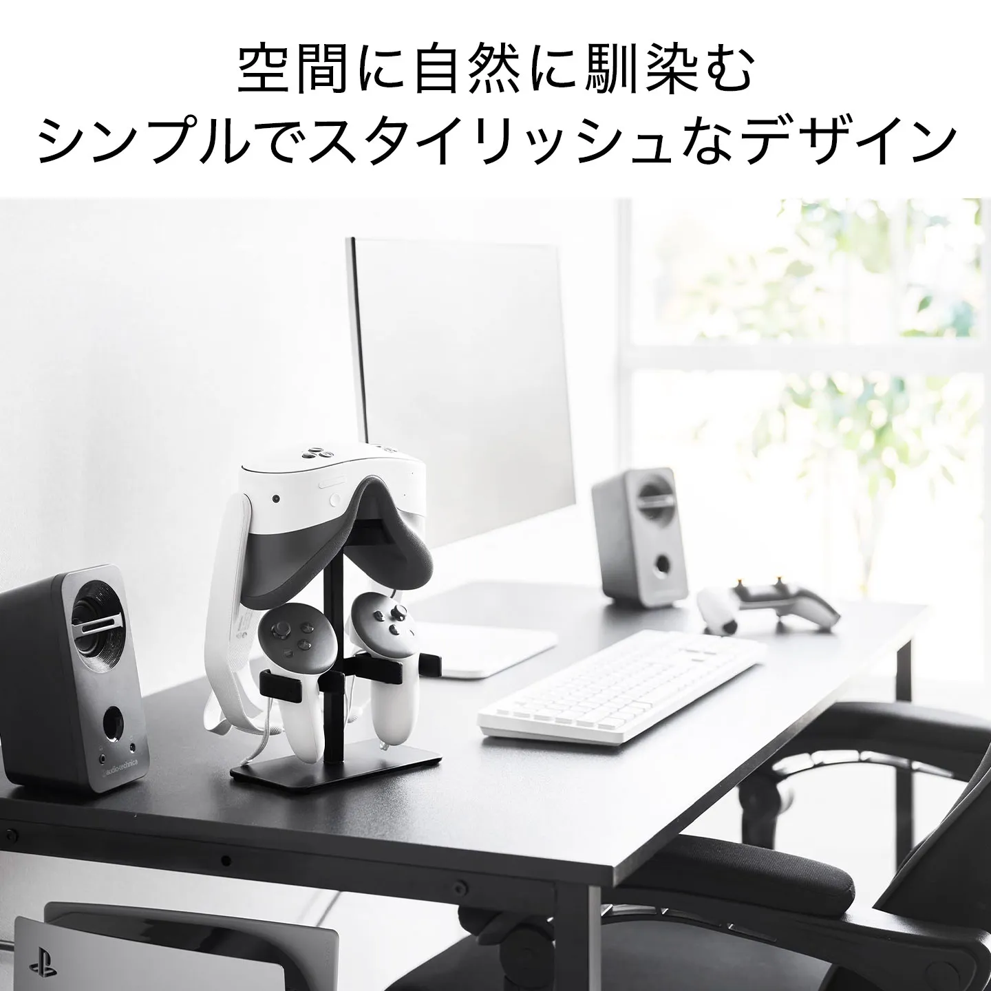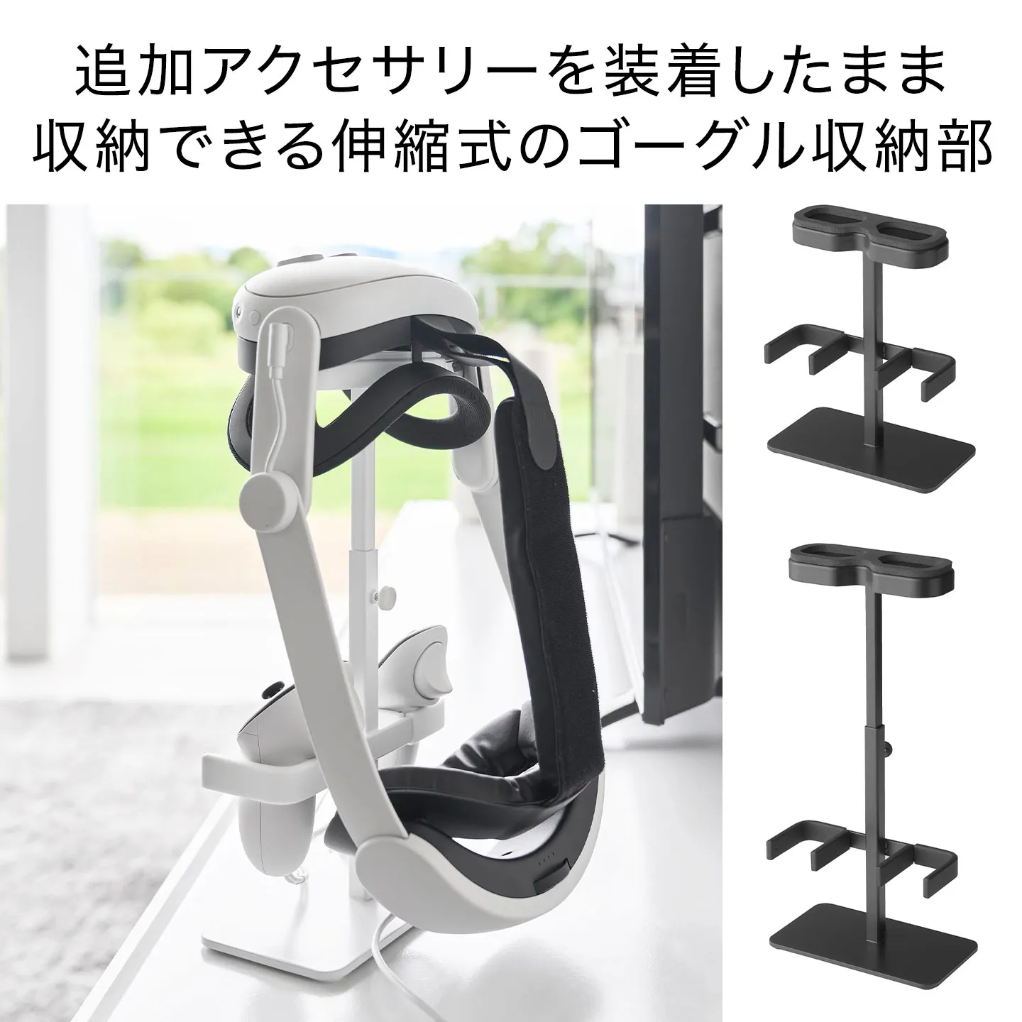 【伸縮VRゴーグル&コントローラー収納ラック】 省スペースでしっかり安定、サッと使える伸縮VRゴーグル&コントローラー収納ラックです。置き場所に困るVRゴーグルやコントローラーを、充電しながらまとめて収納可能。高さを調節できるので、追加アクセサリーを装着したままでも収納できます。VRゴーグルとコントローラーを縦置きでスッキリ整理できる収納ラックです。