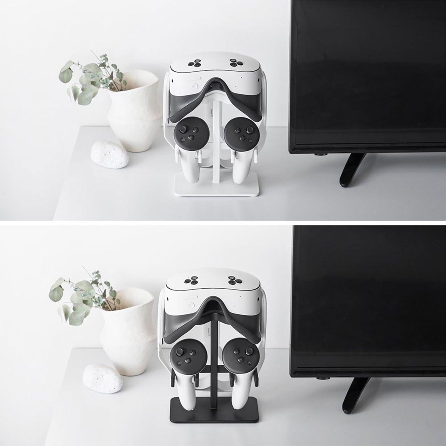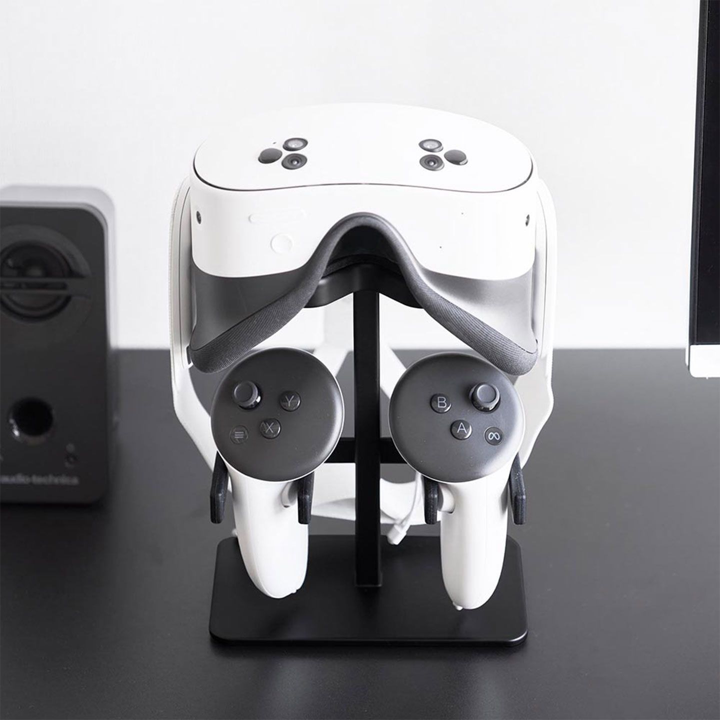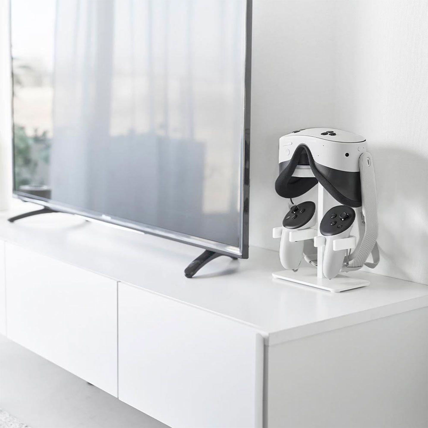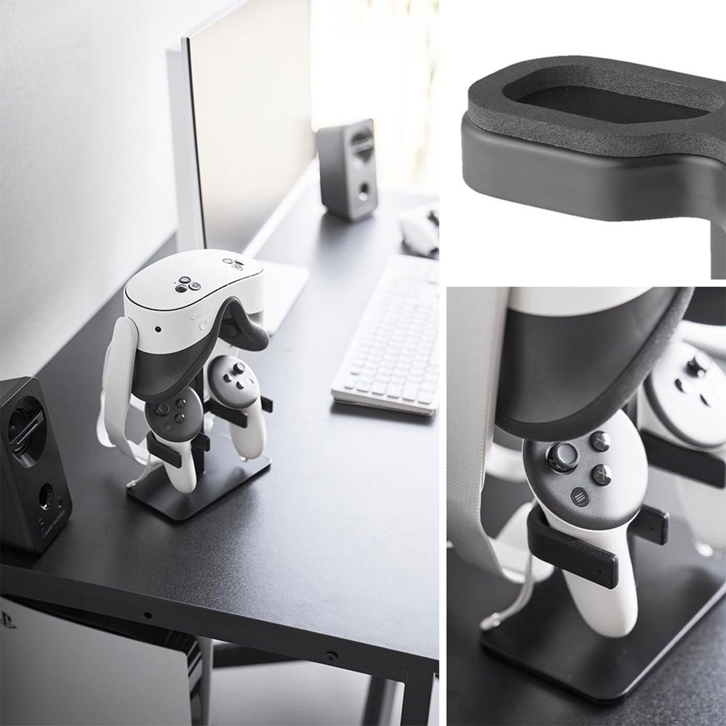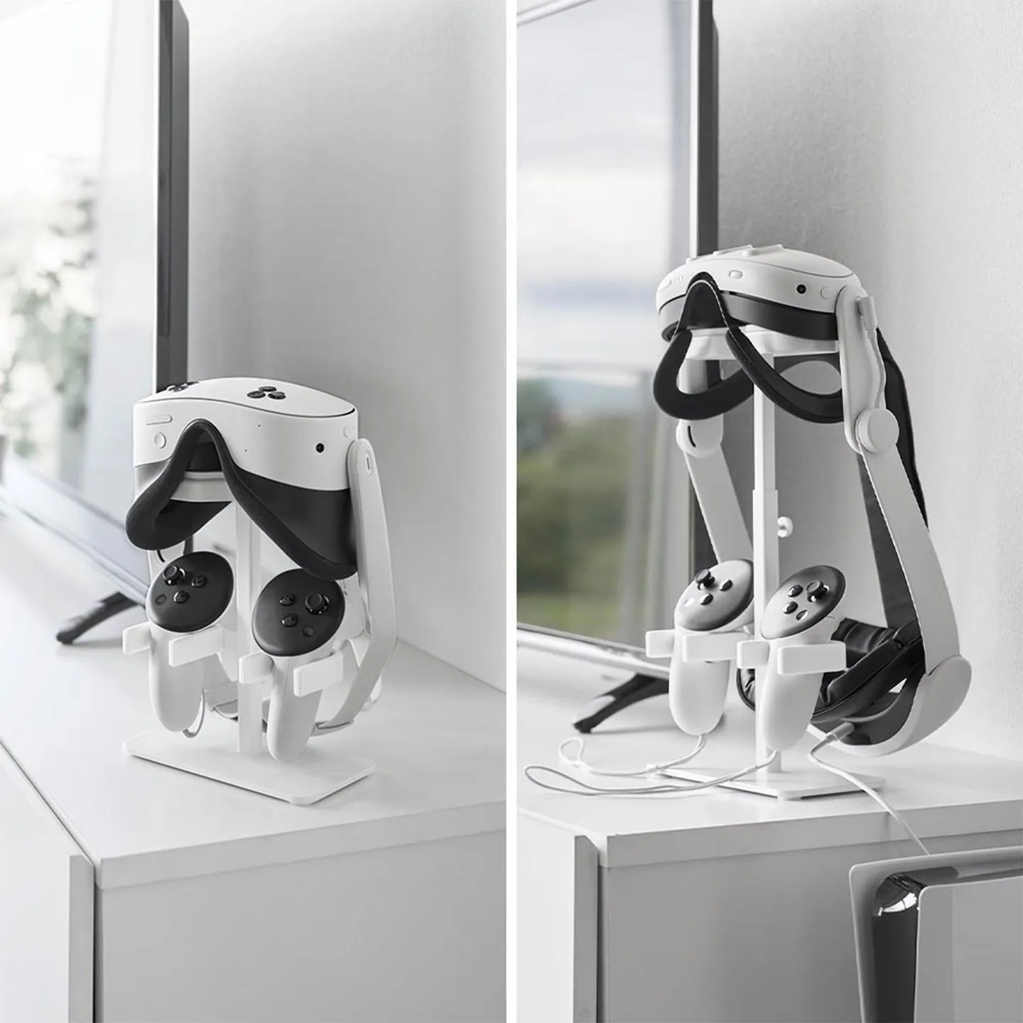 【伸縮VRゴーグル&コントローラー収納ラック】 省スペースでしっかり安定、サッと使える伸縮VRゴーグル&コントローラー収納ラックです。置き場所に困るVRゴーグルやコントローラーを、充電しながらまとめて収納可能。高さを調節できるので、追加アクセサリーを装着したままでも収納できます。VRゴーグルとコントローラーを縦置きでスッキリ整理できる収納ラックです。