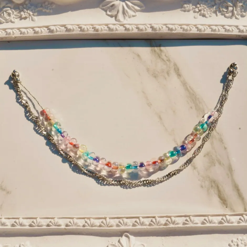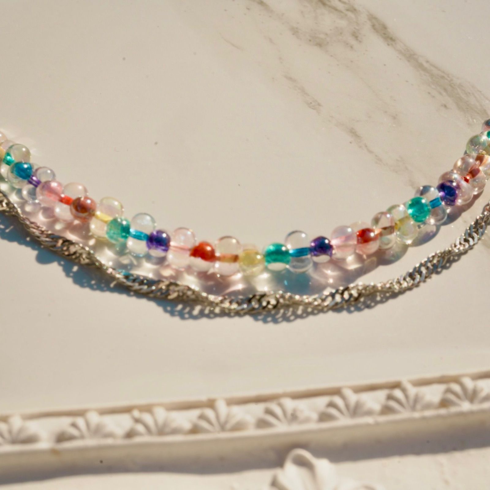 高品質の素材を厳選し、2種類のチェーンと、揺れるチェコガラスビーズで彩ります。