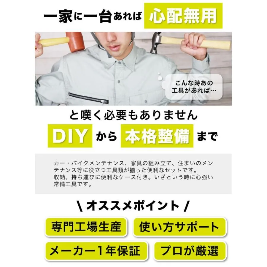 【家庭用として便利な工具セット】 車やバイクのメンテナンスや自転車の修理、家具の組み立て、 住まいのメンテナンスなど、さまざまな作業に役立つ工具が揃った便利なセットです。 収納・持ち運びに便利なケース付きで、車載もできるため、パンクなど緊急時に心強い常備工具となります。