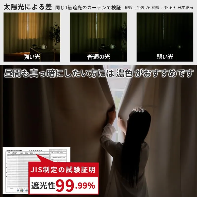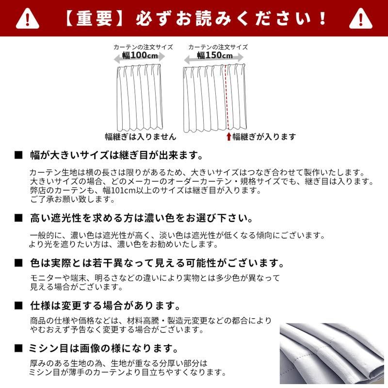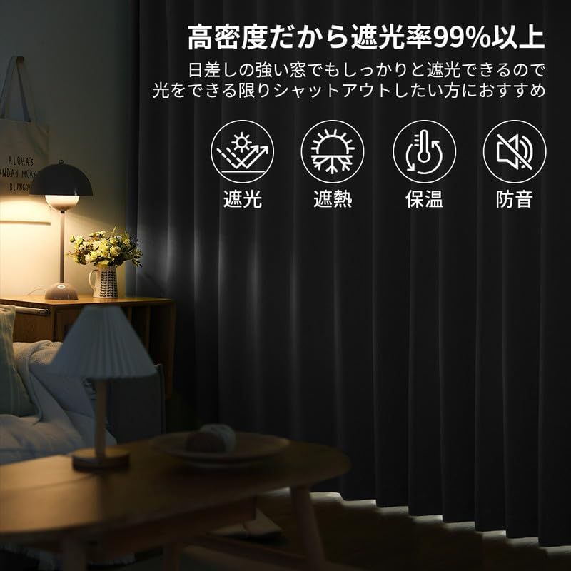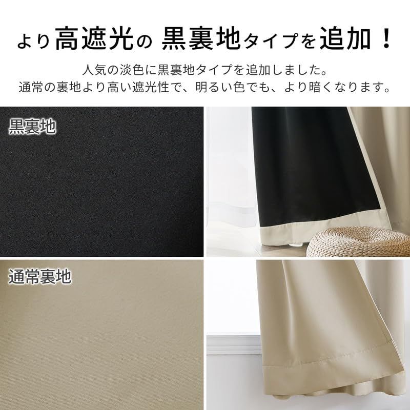 【高い機能性高密度な生地】黒裏地タイプを追加しました。通常の裏地より高い遮光性で、明るい色でも、より暗くなります。黒裏地付きの高密度なカーテンなので、遮光性はもちろん、断熱・保温性を上げて電気代の節約します。
