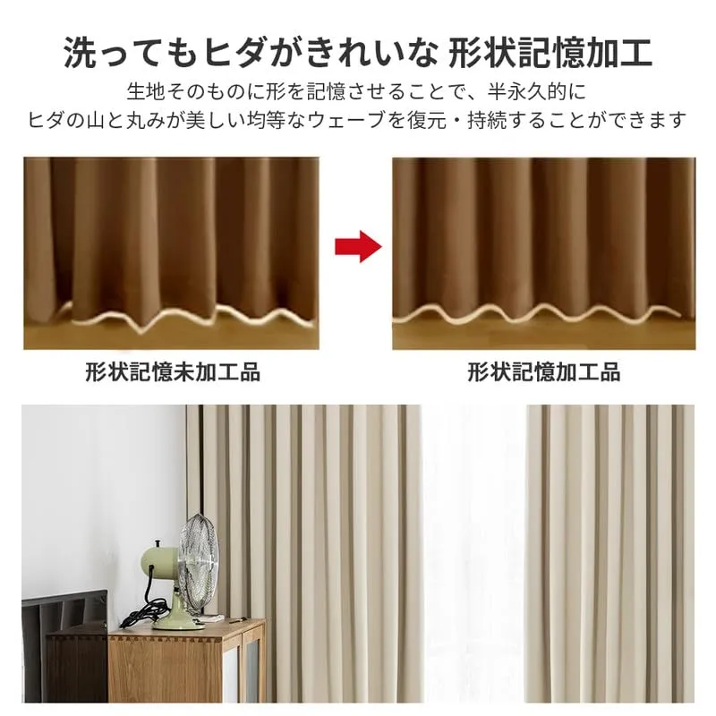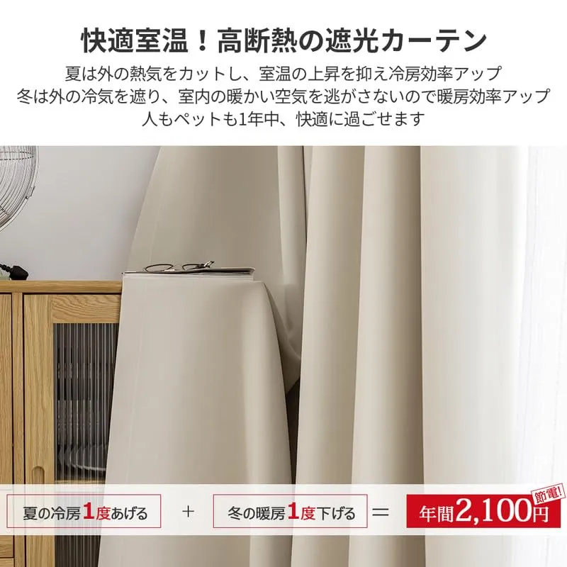 【遮熱保温・形状記憶】届いてすぐ使えるドレープカーテン2枚、同色タッセル付きます。夏は外の熱気をカットし、室温の上昇を抑え冷房効率アップします。冬は外の冷気を遮り、室内の暖かい空気を逃がさないので暖房効率もアップします。ペットにも1年中快適に過ごせます。洗濯機でまるごと洗えます。お手入れしやすいのでいつも清潔に使用できます。カーテンの重みで洗濯ジワも伸ばすことができので、形態安定としてはとても効果が期待できます。 ブランド AIFY 色 ベージュ/裏ブラック 材質 ポリエステル 商品の寸法 135長さ x 100幅 cm 不透明度 遮光1級 配送について、商品のサイズや配送先都道府県によって最適な配送業者を選択しております。 業者・配送方法の指定は承れません。ご了承ください。 万が一の不着、紛失、誤配送の場合など、最後まで責任もって対応致しますのでご安心下さい。 宜しくお願い致します。