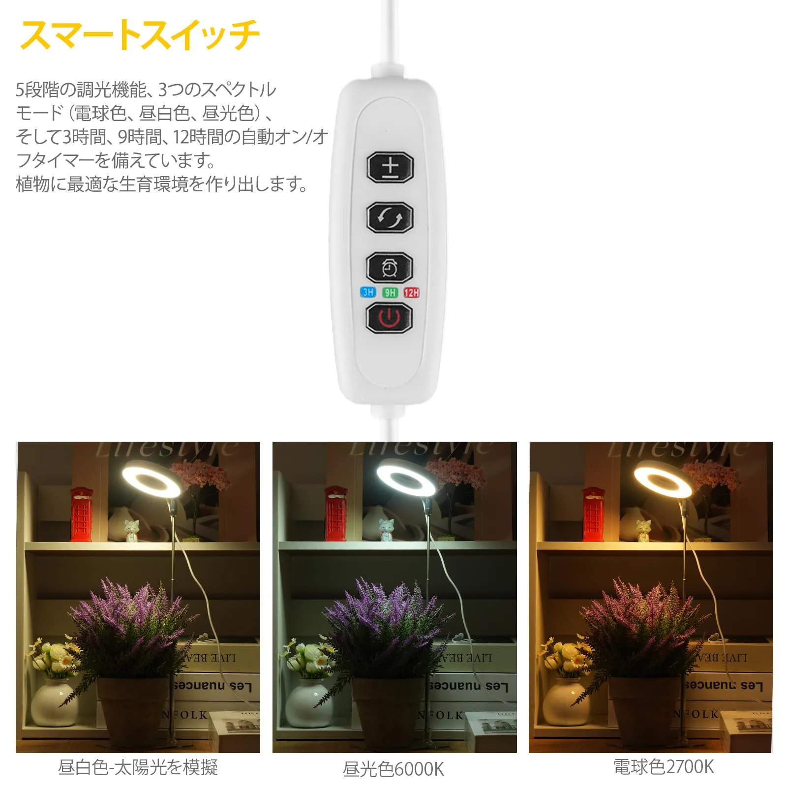 【スマートコントロール機能】5段階の明るさ調整、3種類の光モード(電球色、昼白色、白色)、および自動オン/オフタイマー(3時間、9時間、12時間)を搭載し、理想的な育成環境を提供します。