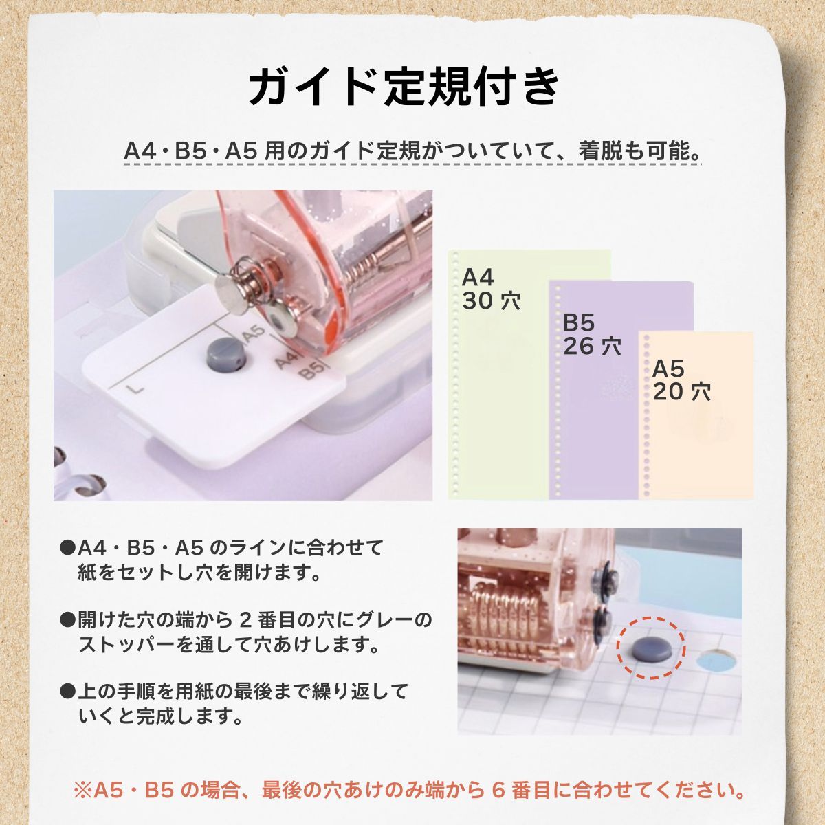 【まっすぐ開けられるガイド定規付き】 A4・B5・A5用のガイド付きのルーズリーフパンチで、まっすぐ綺麗に穴を開けることができます。