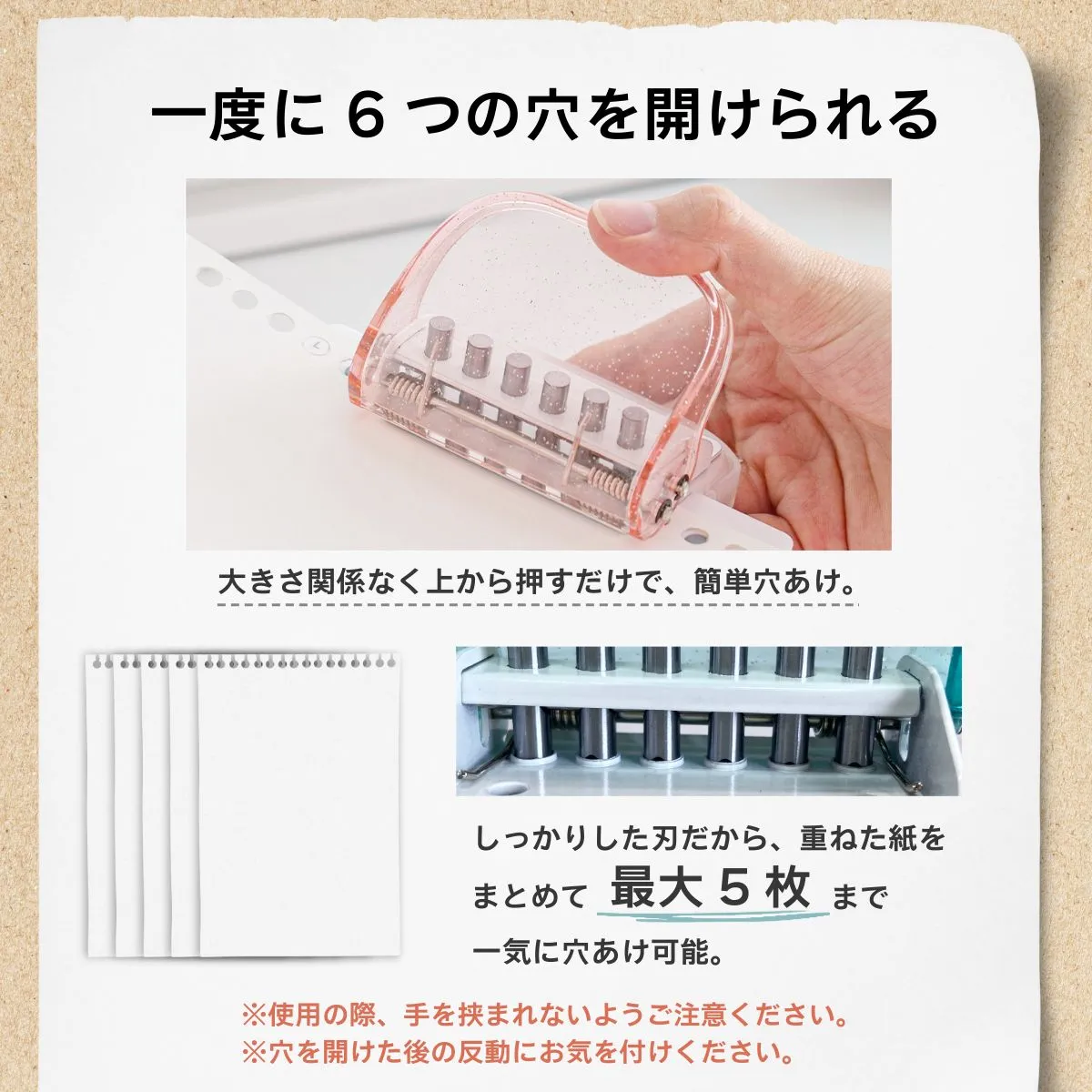 【簡単穴あけ】 どんな大きさの紙でも、ルーズリーフパンチなら上から押すだけで簡単に穴あけできます。
