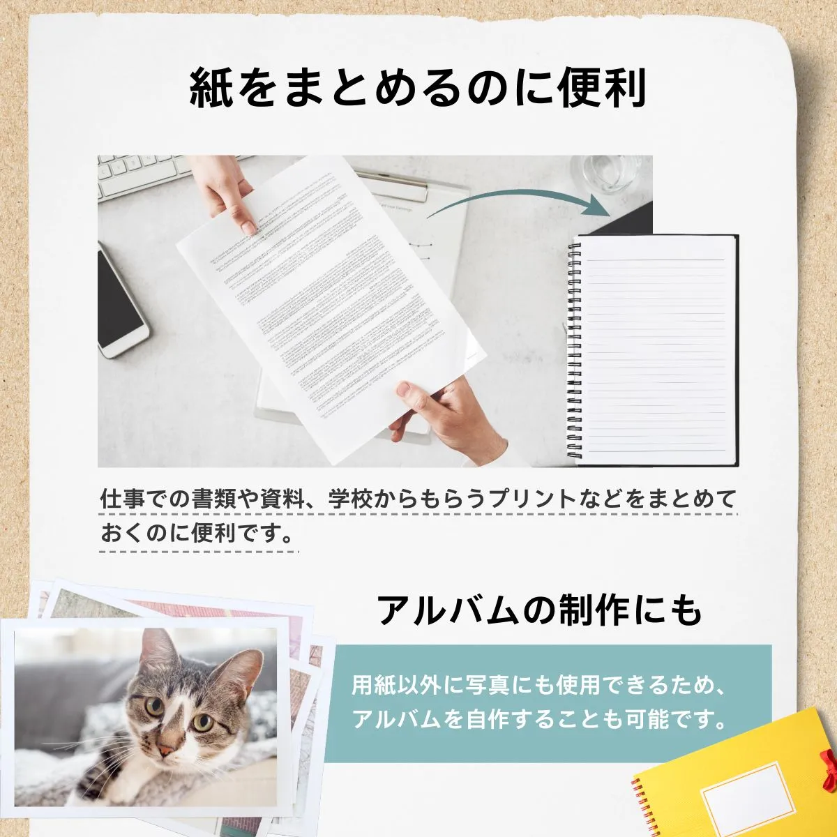 【紙や写真などまとめるのに便利】 ルーズリーフパンチは、書類や資料、学校からもらったプリントなどをまとめるのに便利です。ルーズリーフパンチは、用紙以外に写真にも使用できるので、アルバムづくりにも活躍します。