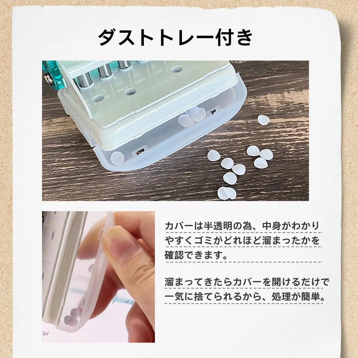 【ゴミ散らばらず、後片付けが簡単になるカバー付き】 ゴミが散らばらないカバー付きのルーズリーフパンチは、透明だから中身を確認出来て、溜まってきたらふたを開けて一気に捨てられるので処理も簡単です。