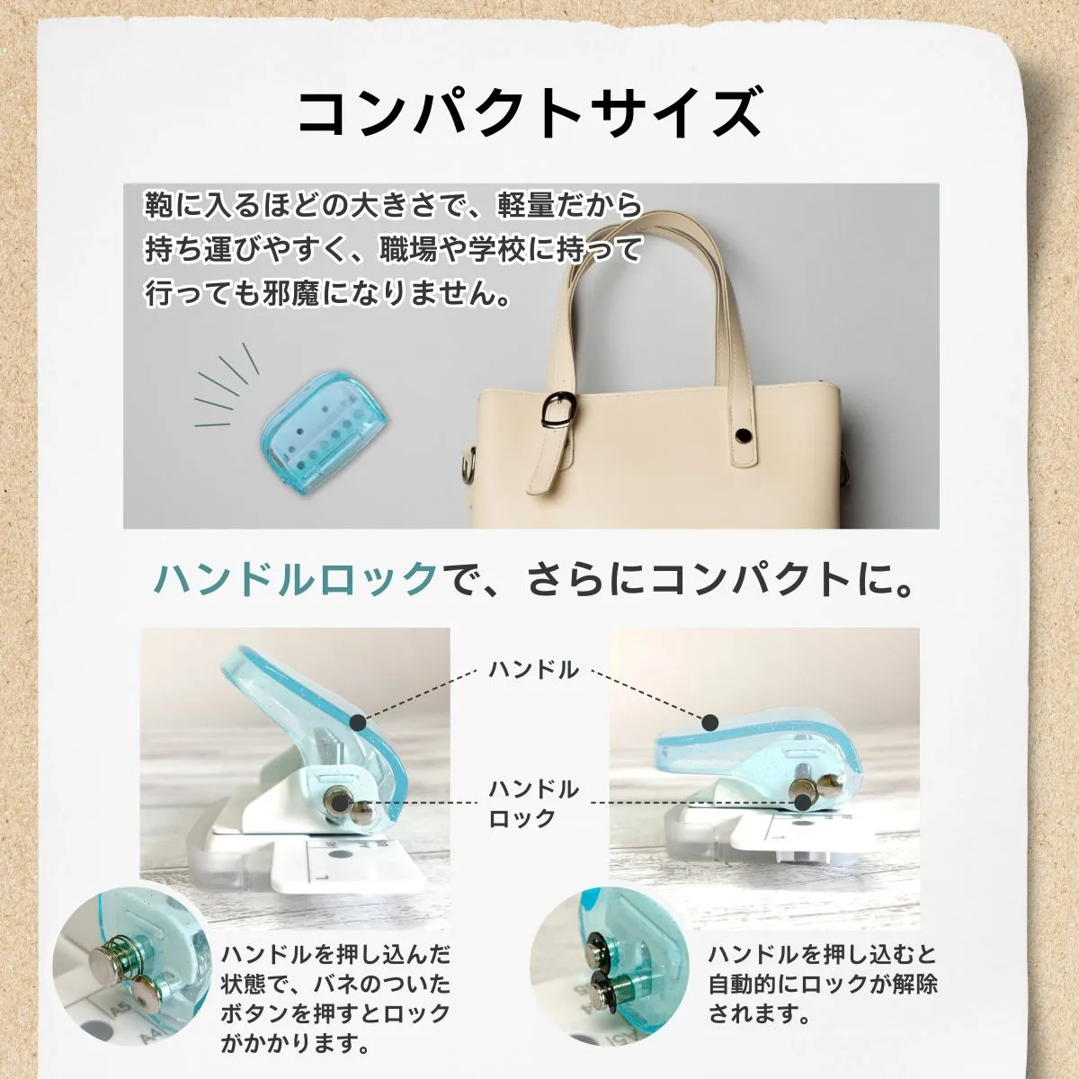 【持ち運びできる丁度いい大きさ】 ルーズリーフパンチはコンパクトだから、職場や学校に持ち運んでも邪魔になりません。