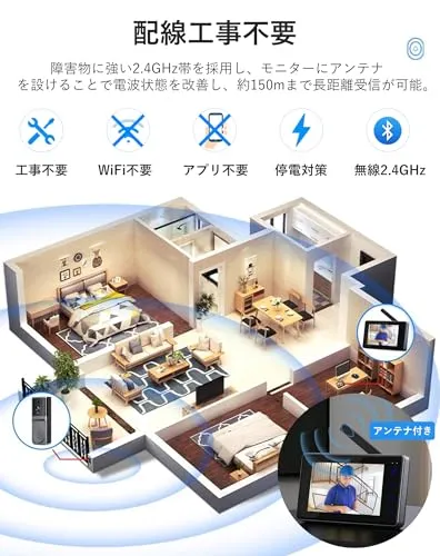 【配線工事不要・ハンズフリーでの双方向通話】ワイヤレスインターホン子機とモニター親機はペアリング済みなので、配線工事やネットワーク設定が不要で、取付簡単なワイヤレステレビドアホンです。ワイヤレスドアホンのモニターにアンテナを設けることで電波状態を改善し、モニター付親機から約150mまで長距離受信が可能。双方向通話機能を搭載しており、手が解放されてコミュニケーションが取れますので来訪者の姿を確認しながら会話が可能。
