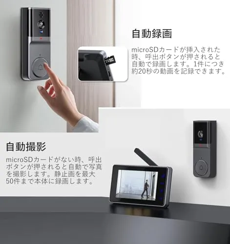【自動録画・自動上書き保存】留守中の来訪者画像をモニター親機に自動で録画・保存できる録画機能を内蔵しており、帰宅後、写真や映像をモニター画面で確認できます。1件につき1枚の静止画を本体に最大50件録画可能。microSDカードをセットすれば、1件につき約20秒の動画も記録できます。自動的に不審者の映像が保存でき、録画映像の再生時には録画された日付・日時も確認でき、防犯対策にもおすすめのワイヤレスチャイムです。メモリーカードのデータ容量がいっぱいになると自動で上書きされます。