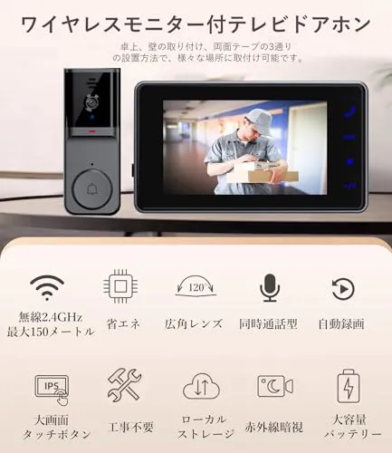 ZAIDER テレビドアホン インターホン カメラ付き 工事不要 【双方向通話/自動録画/暗視/長距離無線】 ドアホン ワイヤレス 2.4GHz無線 最大150メートル 赤外線暗視 玄関チャイム 屋外/室内 LEDライト付き USB充電 800mAhバッテpo