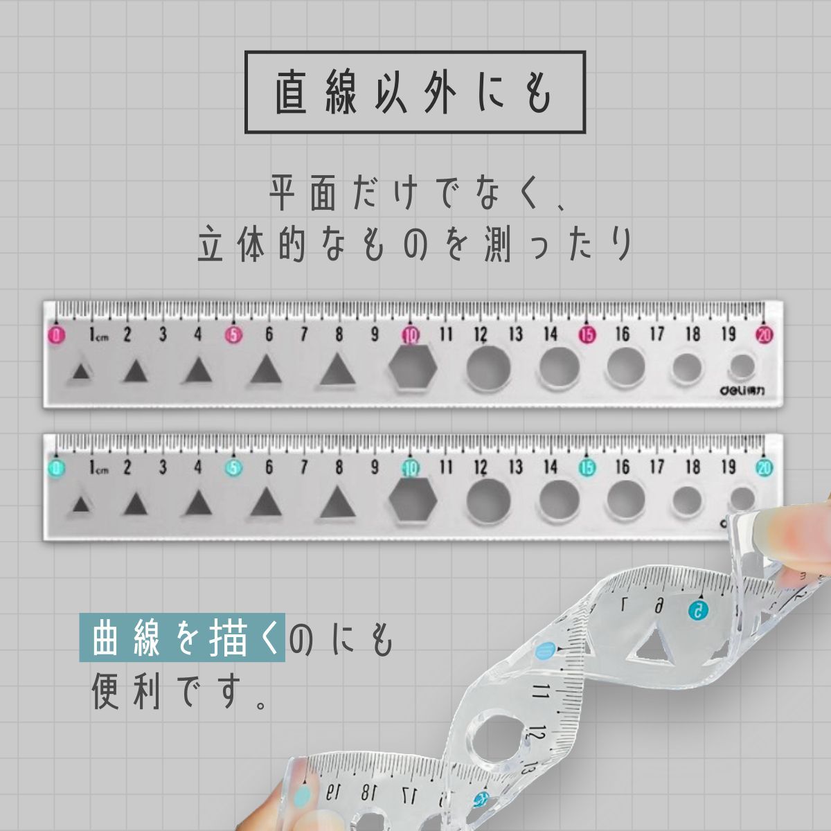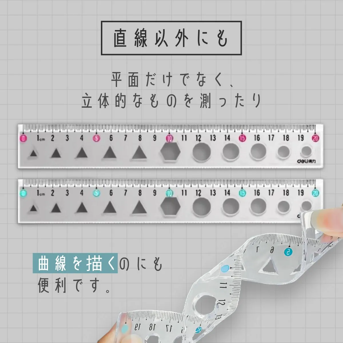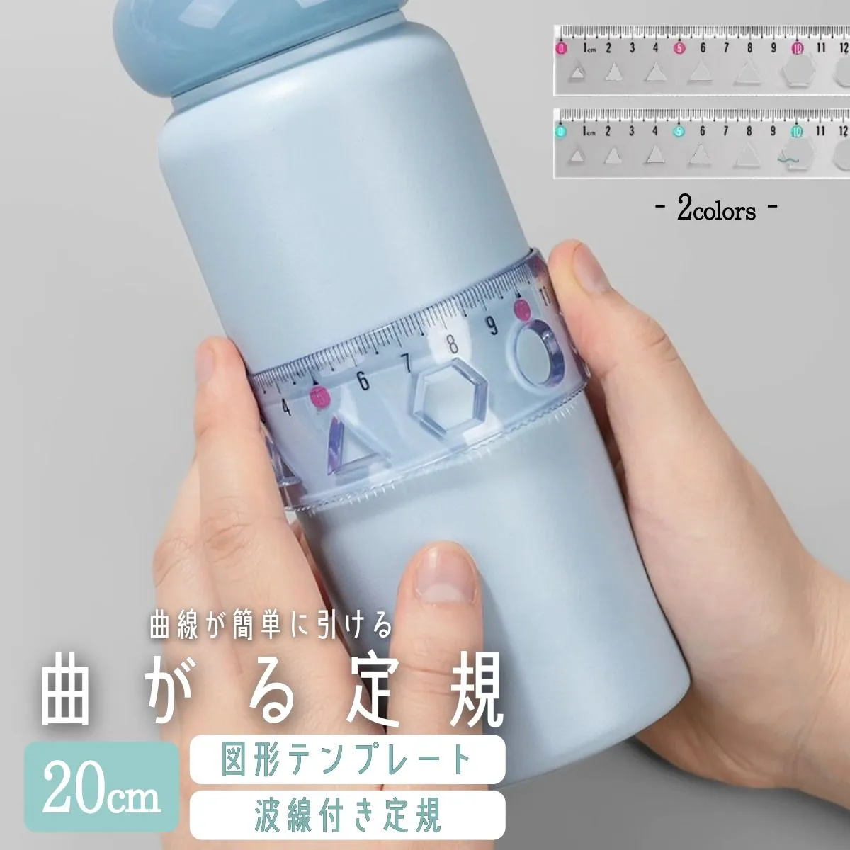 曲がる定規 定規 20cm 文房具 文具 目盛り 線 直線 曲線 波線 図形 幾何学的 柔軟性 テンプレート 丸 円 三角 六角形 透明 クリア ペンケース 筆箱 持ち運び 学校 授業 勉強 学生 小学生 中学生 高校生 仕事 職場 事務 設計 デザイナー