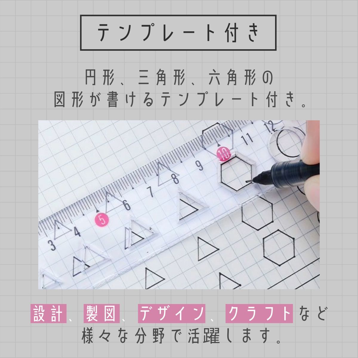 【テンプレート付きの曲がる定規】 円や三角などの図形が書ける曲がる定規用のテンプレート付きです。テンプレートもついた曲がる定規なので、図形をきれいに書くことができます。