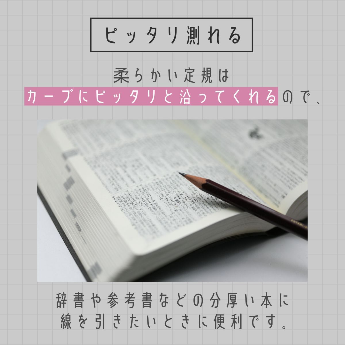 【カーブに沿ってピッタリ測れる曲がる定規】 カーブに沿ってピッタリ測れるので、曲がる定規を使えば参考書や辞書などの分厚い本の文字にだって線を引きやすいのが特徴です。厚みのある本にも沿うので、曲がる定規は様々な用途で活躍します。